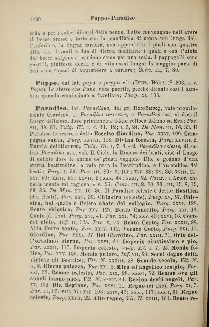 Paradiso, lat. Paradisus, dal gr. IlapocSsiaog, vale propriamente Giardino. 1. Paradiso terrestre, e Paradiso ass. si dice il Luogo delizioso, dove primamente Iddio collocò Adamo ed Eva; Par. vii, 38, 87. Vulg. El. i, 4, 11, 12; i, 5, 24. Pe Mon. in, 16, 33. Il Paradiso terrestre è detto Eccelso Giardino, Par. xxvi, 100. Campagna santa, Purg. xxviii, 118. Divina foresta, Purg. xxviii, 2. Patria delitiaruni, Vulg. El. i, 7, 8. - 2. Paradiso celeste, di solito Paradiso ass., vale II Cielo, la Dimora dei beati, cioè il Luogo di delizie dove le anime de' giusti veggono Dio, e godono d'una eterna beatitudine; e vale pure la Beatitudine, e l'Assemblea dei beati; Purg. i, 99. Par. iit, 89; x, 105; xiv, 38; xv, 36; xviii, 21; xxi, 59; xxiii, 61; xxvii, 2; xxx, 44; xxxi, 52. Canz. : « Amor, che nella mente mi ragiona, » v. 56. Conv. in, 8, 28, 33; ni, 15, 8, 15, 39, 85. Pe Mon. ni, 16, 36. Il Paradiso celeste è detto: Basilica (dei Beati), Par. xxv, 30. Chiostro (celeste), Purg. xv, 57. Chiostro, nel quale è Cristo abate del collegio, Purg. xxvi, 128. Beato chiostro, Par. xxv, 127. Beato Concilio, Purg. xxi, 16. Corte (di Dio), Purg. xvi, 41. Par. xxi, 74; xxv, 43; xxvi, 16. Corte del cielo, Inf. n, 125. Par. x, 70. Beata Corte, Par. xxxii, 98. Alta Corte santa, Par. xxiv, 112. Verace Corte, Purg. xxi, 17. Giardino, Par. xxxi, 97. Bel Giardino, Par. xxiii, 71. Orto dell'ortolano eterno, Par. xxvi, 64. Imperio giustissimo e pio, Par. xxxii, 117. Imperio celeste, Vulg. El. i, 7, 25. Mondo felice, Par. xxv, 139. Mondo pulcro, Inf. vii, 58. Secol degno della virtute (di Beatrice), Vit. N. xxxiii, 28. Grande secolo, Vit. N. li, 8. Eterno palazzo, Par. xxr, 8. Miro ed angelico tempio, Par. xxi, 53. Reame (celeste), Par. xix, 28; xxxii, 52. Reame ove gli angeli hanno pace, Vit. N. xxxii, 41. Region degli angeli, Par. xx, 102. Dia Regione, Par. xxvi, 11. Regno (di Dio), Purg. xi, 7. Par. in, 83; vili, 97; xix, 103; xxiv, 43; xxxi, 117; xxxii, 61. Regno celeste, Purg. xxxii, 22. Alto regno, Vit. N. xxiii, 164. Beato re-