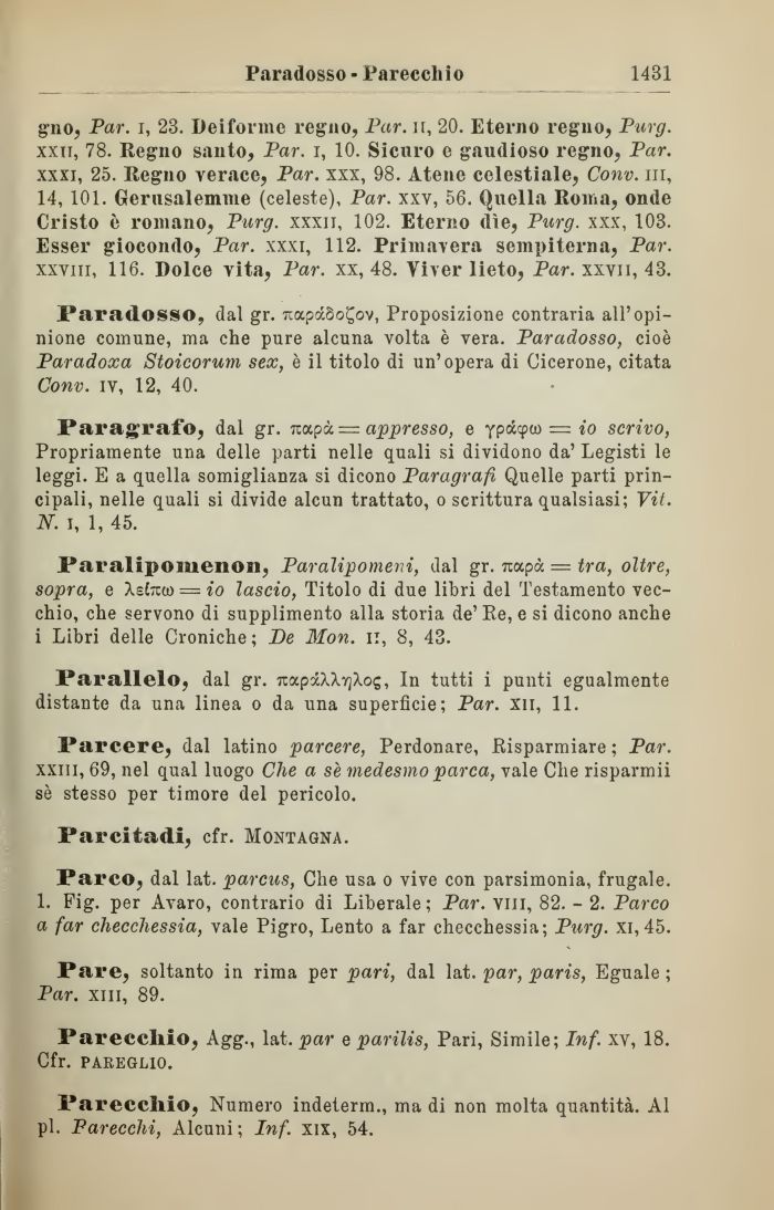 Parecchio, Agg., lat. par e parilis, Pari, Simile; Inf. xv, 18. Cfr. pareglio.