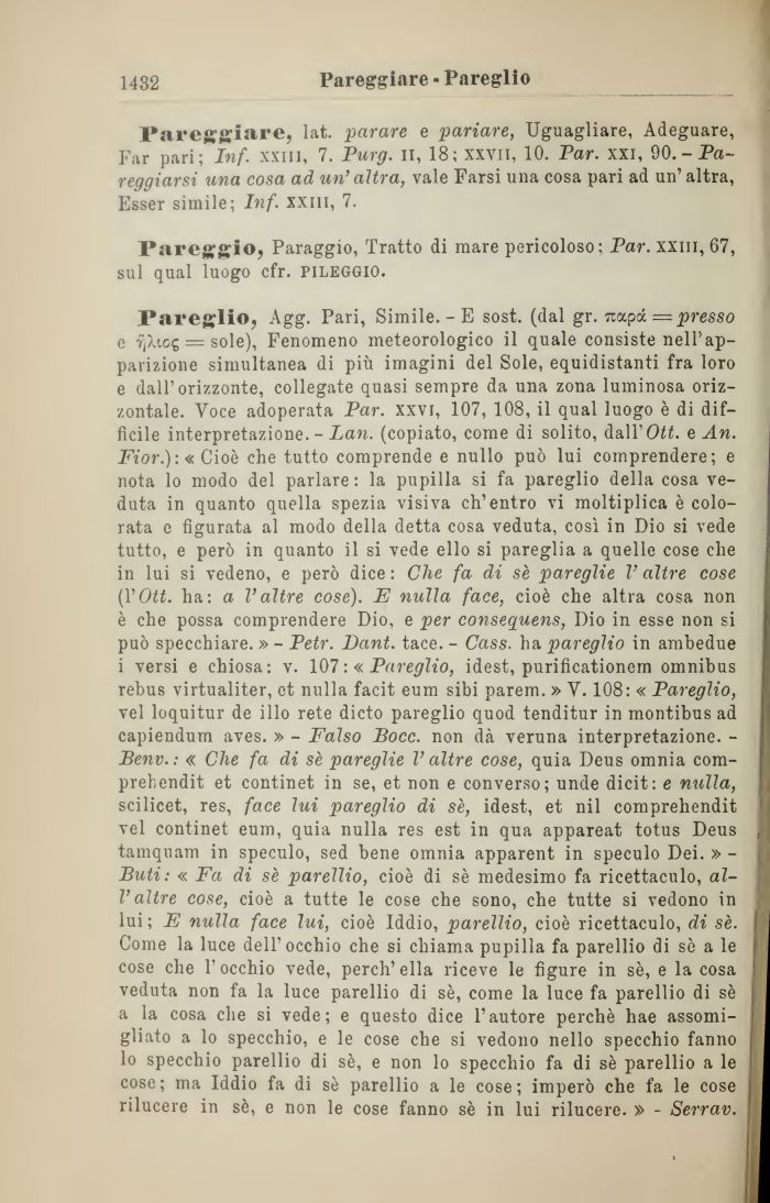 Pareglio, Agg. Pari, Simile. - E sost. (dal gr. Ttapa = presso e 7//Ug{; = sole), Fenomeno meteorologico il quale consiste nell'apparizione simultanea di più imagini del Sole, equidistanti fra loro e dall'orizzonte, collegate quasi sempre da una zona luminosa orizzontale. Voce adoperata Par. xxvi, 107, 108, il qual luogo è di difficile interpretazione. - Lan. (copiato, come di solito, dall'Oc, e An. Fior.): « Cioè che tutto comprende e nullo può lui comprendere; e nota lo modo del parlare : la pupilla si fa pareglio della cosa veduta in quanto quella spezia visiva ch'entro vi moltiplica è colorata e figurata al modo della detta cosa veduta, così in Dio si vede tutto, e però in quanto il si vede elio si pareglia a quelle cose che in lui si vedeno, e però dice : Che fa di sè pareglie l'altre cose (VOtt. ha: a l'altre cose). E nulla face, cioè che altra cosa non è che possa comprendere Dio, e per consequens, Dio in esse non si può specchiare. » - Petr. Dant. tace. - Cass. ha pareglio in ambedue i versi e chiosa: v. 107:« Pareglio, idest, purificationem omnibus rebus virtualiter, et nulla facit eum sibi parem. » V. 108: « Pareglio, vel loquitur de ilio rete dicto pareglio quod tenditur in montibus ad capiendum aves. » - Falso Bocc. non dà veruna interpretazione. -Benv.: « Che fa di sè pareglie l'altre cose, quia Deus omnia com-prehendit et continet in se, et non e converso; unde dicit: e nulla, scilicet, res, face lui pareglio di sè, idest, et nil comprehendit vel continet eum, quia nulla res est in qua appareat totus Deus tamquam in speculo, sed bene omnia apparent in speculo Dei. » -Buti: « Fa di sè parellio, cioè di sè medesimo fa ricettaculo, all'altre cose, cioè a tutte le cose che sono, che tutte si vedono in lui; E nulla face lui, cioè Iddio, parellio, cioè ricettaculo, di sè. Come la luce dell'occhio che si chiama pupilla fa parellio di sè a le cose che l'occhio vede, perch'ella riceve le figure in sè, e la cosa veduta non fa la luce parellio di sè, come la luce fa parellio di sè a la cosa che si vede; e questo dice l'autore perchè hae assomigliato a lo specchio, e le cose che si vedono nello specchio fanno lo specchio parellio di sè, e non lo specchio fa di sè parellio a le cose; ma Iddio fa di sè parellio a le cose; imperò che fa le cose rilucere in sè, e non le cose fanno sè in lui rilucere. » - Serrav.