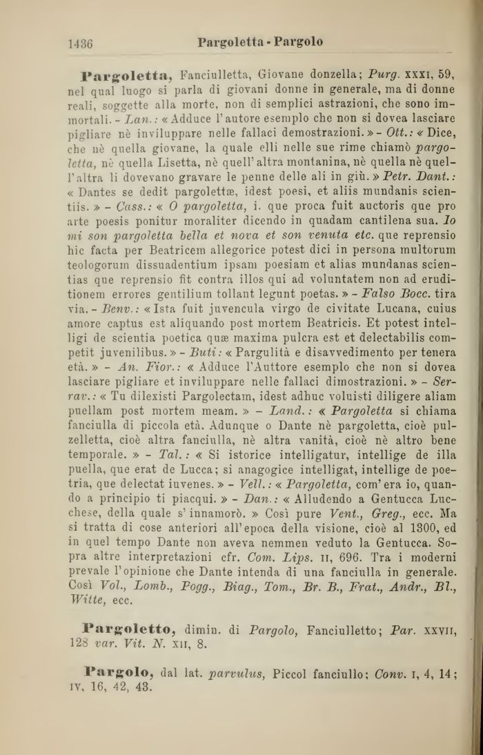 Pargoletta, Fanciulletta, Giovane donzella; Purg. xxxi, 59, nel qual luogo si parla di giovani donne in generale, ma di donne reali, soggette alla morte, non di semplici astrazioni, che sono immortali. - Lati.: «Adduce l'autore esemplo che non si dovea lasciare pigliare nè inviluppare nelle fallaci demostrazioni. » - Ott.: « Dice, che uè quella giovane, la quale elli nelle sue rime chiamò pargoletta, ne quella Lisetta, nè quell'altra montanina, nè quella nè quell'altra li dovevano gravare le penne delle ali in gin.» Petr. Dant.: « Dantes se dedit pargoletta, idest poesi, et aliis mundanis scien-tiis. » - Cass.: « 0 pargoletta, i. que proca fuit auctoris que prò arte poesis ponitur moraliter dicendo in quadam cantilena sua. lo mi son pargoletta bella et nova et son venuta etc. que reprensio hic facta per Beatricem allegorice potest dici in persona multorum teologoruin dissuadentium ipsam poesiam et alias mundanas scien-tias que reprensio fit contra illos qui ad voluntatem non ad erudi-tionem errores gentilium tollant legunt poetas. » - Falso Bocc. tira via. - Benv. : « Ista fuit juvencula virgo de civitate Lucana, cuius amore captus est aliquando post mortem Beatricis. Et potest intel-ligi de scientia poetica quaa maxima pulcra est et delectabilis competit juvenilibus. » - Buti: « Pargulità e disavvedimento per tenera età.» - An. Fior.: « Adduce l'Auttore esemplo che non si dovea lasciare pigliare et inviluppare nelle fallaci dimostrazioni. » - Serrar. : « Tu dilexisti Pargolectam, idest adhuc voluisti diligere aliam puellam post mortem meam. » - Land. : « Pargoletta si chiama fanciulla di piccola età. Adunque o Dante nè pargoletta, cioè pul-zelletta, cioè altra fanciulla, nè altra vanità, cioè nè altro bene temporale. » - Tal. : « Si istorice intelligatur, intellige de illa puella, que erat de Lucca; si anagogice intelligat, intellige de poe-tria, que delectat iuvenes. » - Veli. : « Pargoletta, com'era io, quando a principio ti piacqui. » - Dan.: « Alludendo a Gentucca Lucchese, della quale s'innamorò. » Così pure Vent., Greg., ecc. Ma si tratta di cose anteriori all'epoca della visione, cioè al 1300, ed in quel tempo Dante non aveva nemmen veduto la Gentucca. Sopra altre interpretazioni cfr. Com. Lips. il, 696. Tra i moderni prevale l'opinione che Dante intenda di una fanciulla in generale. Così Voi., Lomb., Pogg., Biag., Tom., Br. B., Frat., Andr., Bl, Witte, ecc.