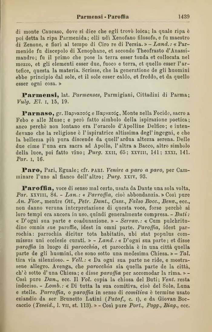 Paroffia, voce di senso mal certo, usata da Dante una sola volta, Par. xxviii, 84. - Lan.: « Parroffia, cioè abbondanzia. » Così pure An. Fior., mentre Ott., Petr. Dant., Cass., Falso Bocc., Benv., ecc., non danno veruna interpretazione di questa voce, forse perchè ai loro tempi era ancora in uso, quindi generalmente compresa. - Buti : « D'ogni sua parte e coadunazione. » - Serrav.: « Cum pulchritu-dine omnis sue paroffie, idest in omni parte. Paroffia, idest par-rochia : parrochia dicitur tota habitatio, ubi stat populus com-missus uni ecclesie curati. » - Land.: « D'ogni sua parte; et disse paroffia in luogo di parocchia, et parocchia è in una città quella parte de gli huomini, che sono sotto una medesima Chiesa.» - Tal. tira via silenzioso. - Veli.: « Da ogni sua parte ne ride, e mostrasene allegro. Avenga, che parocchia sia quella parte de la città, eh'è sotto d'una Chiesa; e disse paroffia per accomodar la rima. » -Così pure Dan., ecc. Il Voi. copia la chiosa del Buti; Vent. resta indeciso. - Lomb.: « Di tutta la sua comitiva, cioè del Sole, Luna e stelle. Parroffia, o paroffia in senso di comitiva è termine usato eziandio da ser Brunetto Latini (Pataf., c. i), e da Giovan Boccaccio (Teseid., 1. vii, st. 113). » - Così pure Pori., Pogg., Biag., ecc.