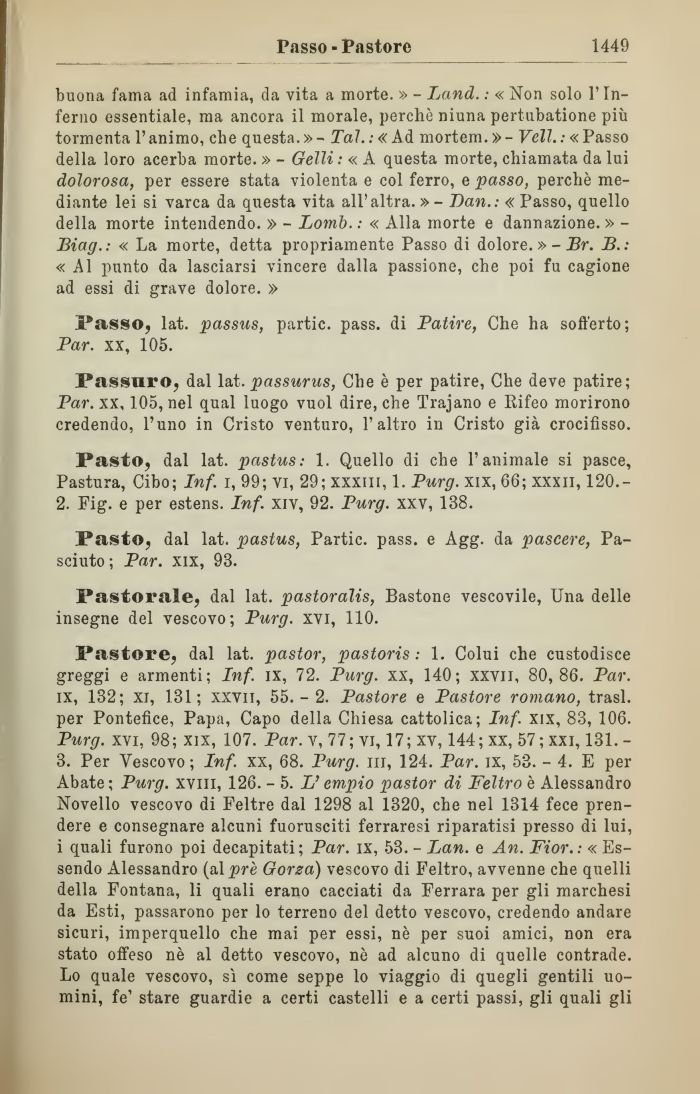 3. Per Vescovo; Inf. xx, 68. Purg. in, 124. Par. IX, 53. - 4. E per Abate; Purg. xviii, 126. - 5. L'empio pastor di Feltro è Alessandro Novello vescovo di Feltre dal 1298 al 1320, che nel 1314 fece prendere e consegnare alcuni fuorusciti ferraresi riparatisi presso di lui, i quali furono poi decapitati ; Par. ix, 53. - Lan. e An. Fior. : « Essendo Alessandro (al pre Gorsa) vescovo di Feltro, avvenne che quelli della Fontana, li quali erano cacciati da Ferrara per gli marchesi da Esti, passarono per lo terreno del detto vescovo, credendo andare sicuri, imperquello che mai per essi, nè per suoi amici, non era stato offeso nè al detto vescovo, nè ad alcuno di quelle contrade. Lo quale vescovo, sì come seppe lo viaggio di quegli gentili uomini, fe' stare guardie a certi castelli e a certi passi, gli quali gli