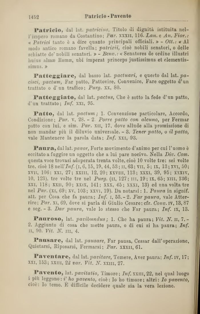 Pavento, lat. pavitatio, Timore; Inf. xxiii, 22, nel qual luogo i più leggono : i\ ho pavento, cioè : Io ho timore ; altri : Io pavento, cioè: Io temo. E difficile decidere quale sia la vera lezione.