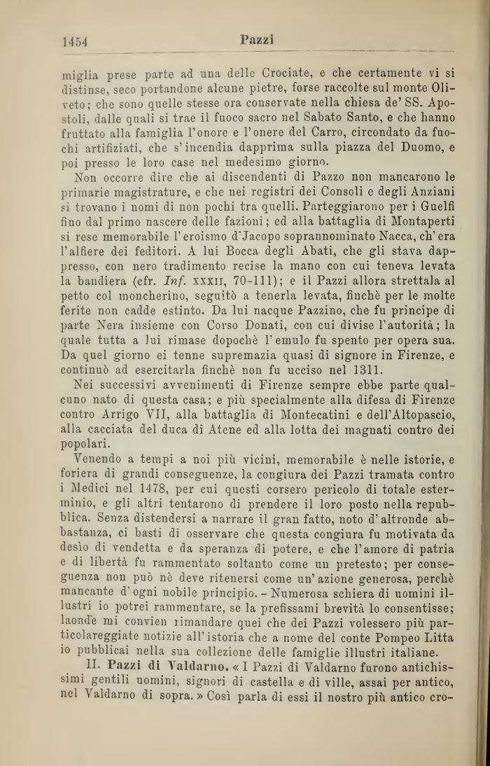 II. Pazzi di Valdarno. « I Pazzi di Valdarno furono antichissimi gentili uomini, signori di castella e di ville, assai per antico, nel Valdarno di sopra. » Così parla di essi il nostro più antico ero-