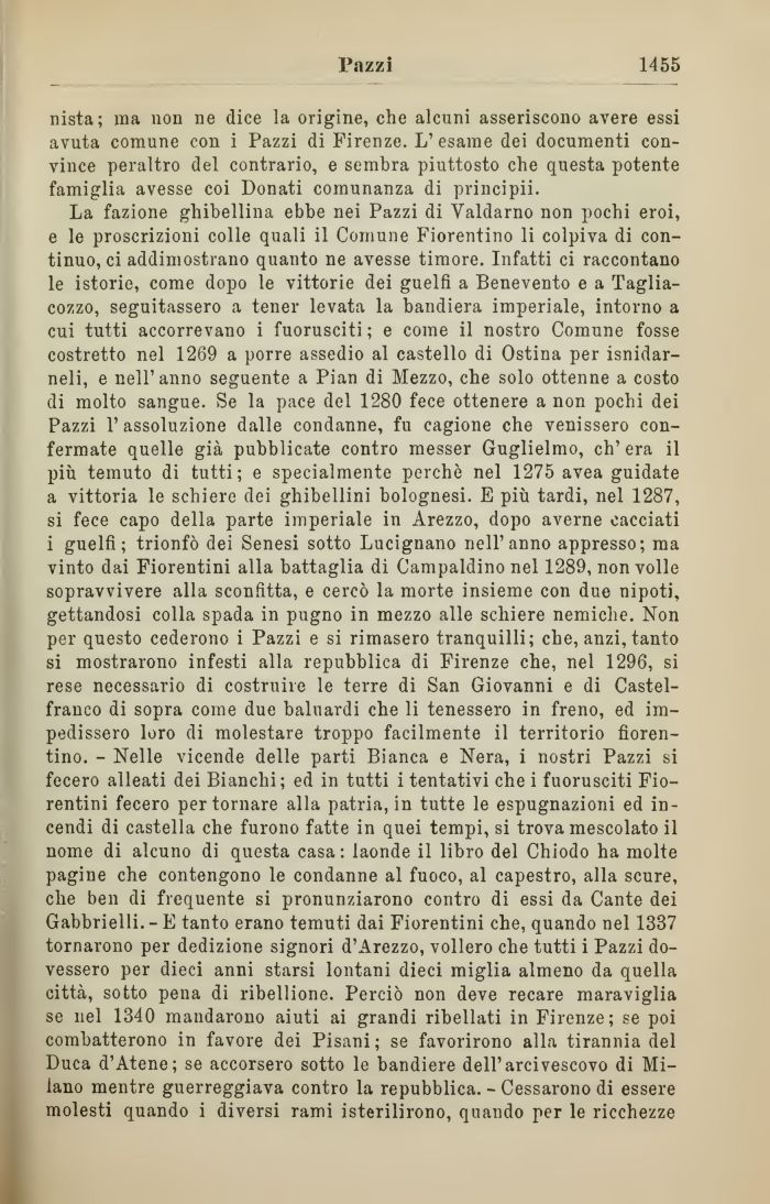 La fazione ghibellina ebbe nei Pazzi di Yaldarno non pochi eroi, e le proscrizioni colle quali il Comune Fiorentino li colpiva di continuo, ci addimostrano quanto ne avesse timore. Infatti ci raccontano le istorie, come dopo le vittorie dei guelfi a Benevento e a Taglia-cozzo, seguitassero a tener levata la bandiera imperiale, intorno a cui tutti accorrevano i fuorusciti ; e come il nostro Comune fosse costretto nel 1269 a porre assedio al castello di Ostina per isnidar-neli, e nell'anno seguente a Pian di Mezzo, che solo ottenne a costo di molto sangue. Se la pace del 1280 fece ottenere a non pochi dei Pazzi 1' assoluzione dalle condanne, fu cagione che venissero confermate quelle già pubblicate contro messer Guglielmo, ch'era il più temuto di tutti; e specialmente perchè nel 1275 avea guidate a vittoria le schiere dei ghibellini bolognesi. E più tardi, nel 1287, si fece capo della parte imperiale in Arezzo, dopo averne cacciati i guelfi; trionfò dei Senesi sotto Lucignano nell'anno appresso; ma vinto dai Fiorentini alla battaglia di Campaldino nel 1289, non volle sopravvivere alla sconfitta, e cercò la morte insieme con due nipoti, gettandosi colla spada in pugno in mezzo alle schiere nemiche. Non per questo cederono i Pazzi e si rimasero tranquilli; che, anzi, tanto si mostrarono infesti alla repubblica di Firenze che, nel 1296, si rese necessario di costruire le terre di San Giovanni e di Castelfranco di sopra come due baluardi che li tenessero in freno, ed impedissero loro di molestare troppo facilmente il territorio fiorentino. - Nelle vicende delle parti Bianca e Nera, i nostri Pazzi si fecero alleati dei Bianchi; ed in tutti i tentativi che i fuorusciti Fiorentini fecero per tornare alla patria, in tutte le espugnazioni ed incendi di castella che furono fatte in quei tempi, si trova mescolato il nome di alcuno di questa casa: laonde il libro del Chiodo ha molte pagine che contengono le condanne al fuoco, al capestro, alla scure, che ben di frequente si pronunziarono contro di essi da Cante dei Gabbrielli. - E tanto erano temuti dai Fiorentini che, quando nel 1337 tornarono per dedizione signori d'Arezzo, vollero che tutti i Pazzi dovessero per dieci anni starsi lontani dieci miglia almeno da quella città, sotto pena di ribellione. Perciò non deve recare maraviglia se nel 1340 mandarono aiuti ai grandi ribellati in Firenze; se poi combatterono in favore dei Pisani; se favorirono alla tirannia del Duca d'Atene; se accorsero sotto le bandiere dell'arcivescovo di Milano mentre guerreggiava contro la repubblica. - Cessarono di essere molesti quando i diversi rami isterilirono, quando per le ricchezze
