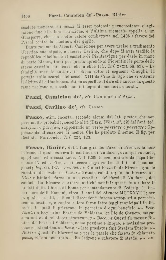 Pazzo, Rinier, della famiglia dei Pazzi di Firenze, famoso ladrone, il quale correva le contrade di Valdarno, ovunque rubando, spogliando ed assassinando. Nel 1269 fu scomunicato da papa Clemente IV ed a Firenze si fecero leggi contro di lui e de' suoi seguaci; Inf. xn, 137. - An. Sei.: « Rinieri Pazzo fu da Firenze, grande rubatore di strade.» - Lan. ; « Grande rubatore; fu da Firenze. » -Ott. : « Rinieri Pazzo fu uno cavaliere de' Pazzi di Valdarno, del contado tra Firenze e Arezzo, antichi uomini: questi fu a rubare li prelati della Chiesa di Roma per comandamento di Federigo II im-peradore delli Romani, circa li anni del Signore MCCXXVI1I; per la qual cosa elli, e li suoi discendenti furono sottoposti a perpetua scomunicazione, e contro a loro furon fatte leggi municipali in Firenze, le quali li privarono in perpetuo d'ogni beneficio. »- Petr. Dant. : « Raynerius Pazzus de Valdarno, et ille de Corneto, magni ascarani et derobatores stratarum. »- Bocc.: « Questi fu messer Rinieri de' Pazzi di Valdarno, uomo pessimo e iniquo, e notissimo predone e malandrino. » - Benv. : «Iste praedatus fuit Stratam Tuscia. »-Buti: « Questo fu Fiorentino e per le pazzie che faceva fu chiamato pazzo, ch'era temerario.... Fu ladrone e rubatore di strade. » - An.