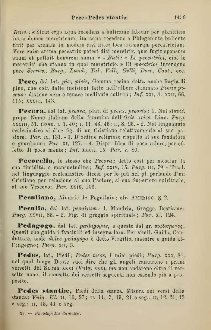 Pecora, dal lat. pecora, plur. di pecus, pecoris; 1. Nel signif. propr. Nome italiano della femmina dell'Ovis aries, Limi. Purg. xxxiii, 51. Conv. i, 1. 40; i, 11, 43, 45; ir, 8, 25.- 2. Nel linguaggio ecclesiastico si dice fig. di un Cristiano relativamente al suo pastore; Par. ix, 131.-3. D'ordine religioso rispetto al suo fondatore o guardiano; Par. xi, 127. - 4. Dispr. Idea di poco valore, per effetto di poca mente; Inf. xxxii, 15. Par. v, 80.