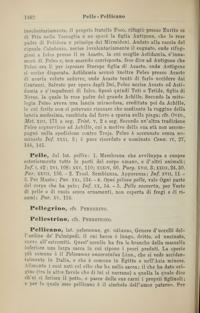 involontariamente, il proprio fratello Foco, rifugiò presso Eurito re di Ftia nella Tessaglia e ne sposò la figlia Antigone, che lo rese padre di Polidora e principe dei Mirmidoni. Andato alla caccia del cignale Caledonio, uccise involontariamente il cognato, onde rifuggissi a Iolco presso il re Acasto, la cui moglie Astidamia, s'innamorò di Peleo e, non essendo corrisposta, fece dire ad Antigone che Peleo era lì per isposare Sterope figlia di Acasto, onde Antigone si uccise disperata. Astidamia accusò inoltre Peleo presso Acasto (li averla voluto sedurre, onde Acasto tentò di farlo uccidere dai Centauri. Salvato per opera degli Dei, Peleo uccise Acasto ed Astidamia e s'impadronì di Iolco. Sposò quindi Teti o Tetide, figlia di Nereo, la quale lo rese padre del grande Achille. Secondo la mitologia Peleo aveva una lancia miracolosa, ereditata poi da Achille, le cui ferite non si potevano risanare che mediante la ruggine della lancia medesima, raschiata dal ferro e sparsa sulla piaga; cfr. Ovid., Met. xiii, 171 e seg. Trist. v, 2 e seg. Secondo un'altra tradizione Peleo sopravvisse ad Achille, cui a motivo della sua età non accompagnò nella spedizione contro Troja. Peleo è accennato senza nominarlo Inf. xxxi, 5; è pure ricordato e nominato Conv. iv, 27, 144, 145.