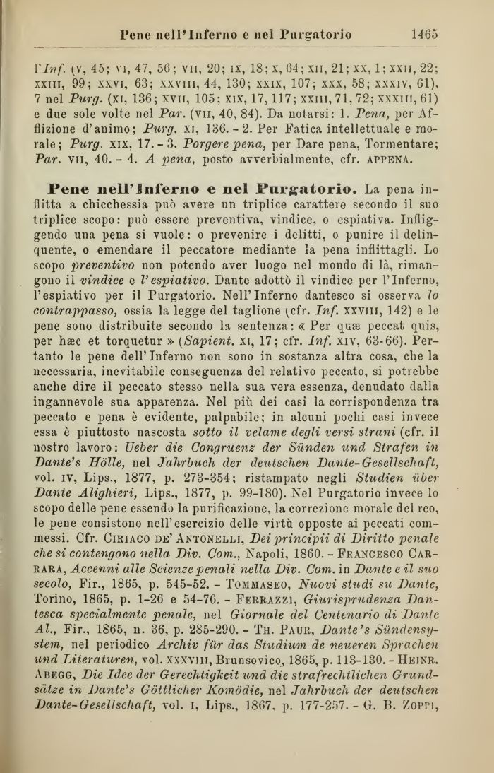 Pene «eli'Inferno e nel Purgatorio. La pena inflitta a chicchessia può avere un triplice carattere secondo il suo triplice scopo: può essere preventiva, vindice, o espiativa. Infliggendo una pena si vuole: o prevenire i delitti, o punire il delinquente, o emendare il peccatore mediante la pena inflittagli. Lo scopo preventivo non potendo aver luogo nel mondo di là, rimangono il vindice e Vespiativo. Dante adottò il vindice per l'Inferno, l'espiativo per il Purgatorio. Nell'Inferno dantesco si osserva lo contrappasso, ossia la legge del taglione i^cfr. Inf. xxvm, 142) e le pene sono distribuite secondo la sentenza :« Per quse peccat quis, per hsec et torquetur » (Sapient. xi, 17; cfr. Inf. xiv, 63-66). Pertanto le pene dell'Inferno non sono in sostanza altra cosa, chela necessaria, inevitabile conseguenza del relativo peccato, si potrebbe anche dire il peccato stesso nella sua vera essenza, denudato dalla ingannevole sua apparenza. Nel più dei casi la corrispondenza tra peccato e pena è evidente, palpabile; in alcuni pochi casi invece essa è piuttosto nascosta sotto il velame degli versi strani (cfr. il nostro lavoro : Ueber die Congruenz der Sùnden und Strafen in Dante's Hòlle, nel Jahrbuch der deutschen Dante- Gesellschaft, voi. iv, Lips., 1877, p. 273-354; ristampato negli Studien iiber Dante Alighieri, Lips., 1877, p. 99-180). Nel Purgatorio invece lo scopo delle pene essendo la purificazione, la correzione morale del reo, le pene consistono nell'esercizio delle virtù opposte ai peccati commessi. Cfr. Ciriaco de'Antonelli, Dei principii di Diritto penale che si contengono nella Div. Coni., Napoli, 1860. - Francesco Carrara, Accenni alle Scienze penali nella Div. Com. in Dante e il suo secolo, Fir., 1865, p. 545-52. - Tommaseo, Nuovi studi su Dante, Torino, 1865, p. 1-26 e 54-76. - Ferrazzi, Giurisprudenza Dantesca specialmente penale, nel Giornale del Centenario di Dante Al., Fir., 1865, n. 36, p. 285-290. - Th. Paur, Dante's Siindensy-stem, nel periodico Archiv fur das Studium de neueren Spraclien und Literaturen, voi. xxxvm, Brunsovico, 1865, p. 113-130. - Heinr.. Abegg, Die Idee der Gerechtiglceit und die strafrechtlichen Grund-sàtze in Dante's Gòttlicher Komòdie, nel Jahrbuch der deutschen Dante-Gesellschaft, voi. i, Lips., 1867, p. 177-257. - G. B. Zoiti,