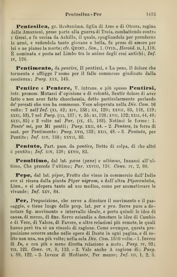 Pentire e Pentere, V. intrans, e più spesso Pentirsi, intr. pronom. Mutarsi d'opinione e di volontà, Sentir dolore di aver fatto o non aver fatto checchessia, detto particolarmente parlando de' peccati che uno ha commesso. Voce adoperata nella Div. Com. 16 volte: 7 ueWInf. (xi, 42; xiv, 138; XX, 120; xxvn, 83, 118, 119; xxxi, 53), 7 nel Purg. (ni, 137; v, 55; xi, 128; xvil, 132; xxu, 44, 48; xxxi, 85) e 2 volte nel Par. (ix, 45, 103). Notinsi le forme : 1. Pente' vii, per Mi pentii; Purg. xxu, 44. - 2. Pentere, in forza di sost. per Pentimento; Purg. x\n, 132; xxu, 48.-3. Pentuto, per Pentito; Inf. xiv, 138; xxvn, 83.