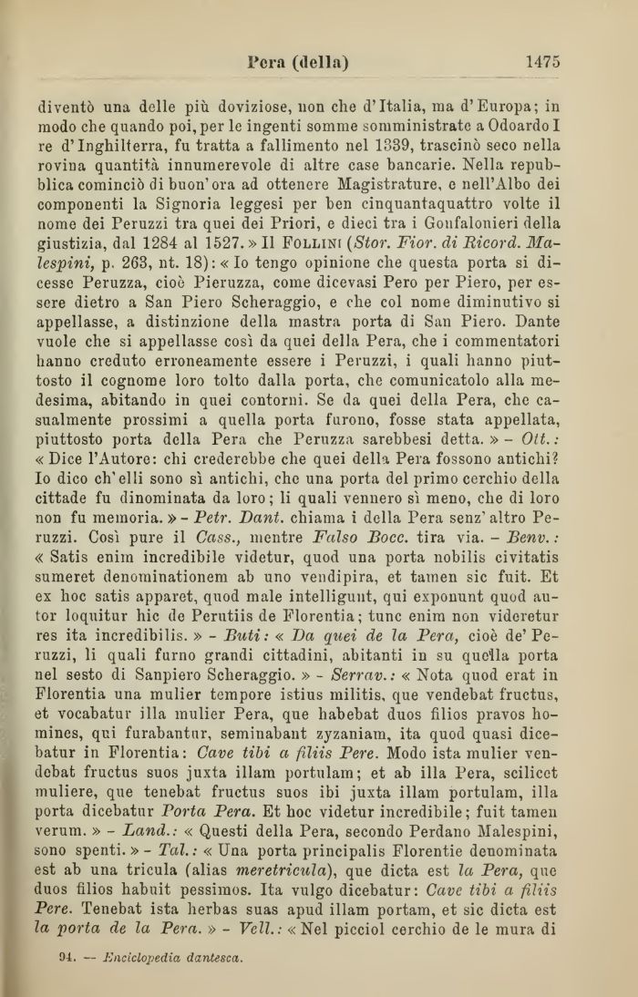 diventò una delle più doviziose, non che d'Italia, ma d'Europa; in modo che quando poi, per le ingenti somme somministrate a Odoardo I re d'Inghilterra, fu tratta a fallimento nel 1339, trascinò seco nella rovina quantità innumerevole di altre case bancarie. Nella repubblica cominciò di buon'ora ad ottenere Magistrature, e nell'Albo dei componenti la Signoria leggesi per ben cinquantaquattro volte il nome dei Peruzzi tra quei dei Priori, e dieci tra i Gonfalonieri della giustizia, dal 1284 al 1527. » Il Follini (Stor. Fior, di Ricord. Ma-lespini, p. 263, nt. 18): «Io tengo opinione che questa porta si dicesse Peruzza, cioè Pieruzza, come dicevasi Pero per Piero, per essere dietro a San Piero Scheraggio, e che col nome diminutivo si appellasse, a distinzione della mastra porta di San Piero. Dante vuole che si appellasse così da quei della Pera, che i commentatori hanno creduto erroneamente essere i Peruzzi, i quali hanno piuttosto il cognome loro tolto dalla porta, che comunicatolo alla medesima, abitando in quei contorni. Se da quei della Pera, che casualmente prossimi a quella porta furono, fosse stata appellata, piuttosto porta della Pera che Peruzza sarebbesi detta.» - Ott. : « Dice l'Autore: chi crederebbe che quei della Pera fossono antichi? Io dico ch'elii sono sì antichi, che una porta del primo cerchio della cittade fu dinominata da loro ; li quali vennero sì meno, che di loro non fu memoria. » - Petr. Dani, chiama i della Pera senz' altro Peruzzi. Così pure il Cass., mentre Falso Bocc. tira via. - Benv. : « Satis enirn incredibile videtur, quod una porta nobilis civitatis sumeret denominationem ab uno vendipira, et tamen sic fuit. Et ex hoc satis apparet, quod male intelligunt, qui exponunt quod autor loquitur hic de Perutiis de Florentia; tunc enim non videretur res ita incredibilis. » - Buti : « Da quei de la Pera, cioè de' Peruzzi, li quali fumo grandi cittadini, abitanti in su quella porta nel sesto di Sanpiero Scheraggio. » - Serrav. : « Nota quod erat in Florentia una mulier tempore istius militis, que vendebat f'ructus, et vocabatur iIla mulier Pera, que habebat duos filios pravos ho-mines, qui furabantur, seminabant zyzaniam, ita quod quasi dice-batur in Florentia: Cave tibi a filiis Pere. Modo ista mulier vendebat fructus suos juxta illam portulam; et ab illa Pera, scilicet muliere, que tenebat fructus suos ibi juxta illam portulam, illa porta dicebatur Porta Pera. Et hoc videtur incredibile; fuit tamen veruni. » - Land.: « Questi della Pera, secondo Perdano Malespini, sono spenti.» - Tal. : « Una porta principalis Florentie denominata est ab una tricula (alias meretricula), que dieta est la Pera, que duos filios habuit pessimos. Ita vulgo dicebatur: Cave tibi a filiis Pere. Tenebat ista herbas suas apud illam portam, et sic dieta est la porta de la Pera. » - Veli.: «Nel picciol cerchio de le mura di