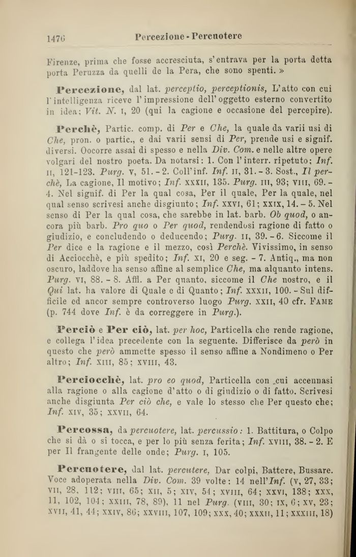 Perchè, Partic. comp. di Per e Glie, la quale da varii usi di Che, pron. o partic., e dai varii sensi di Per, prende usi e signif. diversi. Oocorre assai di spesso e nella Div. Com.e nelle altre opere volgari del nostro poeta. Da notarsi: 1. Con l'interi-, ripetuto; Inf. il, 121-123. Purg. v, 51.-2. Coll'inf. Inf. n, 31.-3. Sost., Il perchè, La cagione, Il motivo; Inf. xxxii, 135. Purg. in, 93; vili, 69.-4. Nel signif. di Per la qual cosa, Per il quale, Per la quale, nel qual senso scrivesi anche disgiunto; Inf. xxvi, 61; xxix, 14.-5. Nel senso di Per la qual cosa, che sarebbe in lat. barb. Ob quod, o ancora più barb. Pro quo o Per quod, rendendosi ragione di fatto o giudizio, e concludendo o deducendo; Purg. ir, 39.-6. Siccome il Per dice e la ragione e il mezzo, così Perche. Vivissimo, in senso di Acciocché, e più spedito; Inf. xi, 20 e seg. - 7. Antiq., ma non oscuro, laddove ha senso affine al semplice Che, ma alquanto intens. Purg. vi, 88. - 8. Affi, a Per quanto, siccome il Che nostro, e il Qui lat. ha valore di Quale e di Quanto; Inf. xxxii, 100. - Sul difficile ed ancor sempre controverso luogo Purg. xxii, 40 cfr. Fame (p. 744 dove Inf. è da correggere in Purg.).