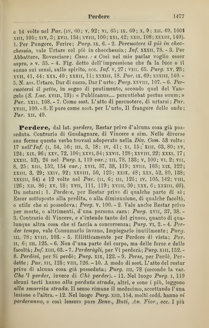 Perdere, dal lat. perdere, Restar privo d'alcuna cosa già posseduta. Contrario di Guadagnare, di Vincere e sim. Nelle diverse sue forme questo verbo trovasi adoperato nella Div. Com. 53 volte: 17 nell'In/, (i, 54, 56; ni, 3, 18; iv, 41; xi, 15; xiii, 63,80; xv, 124; xix, 96; xxv, 72, 100 ; xxvi, 84; xxvii, 128 ; xxviii, 22; xxxi, 17; xxxn, 52), 24 nel Purg. i, 119 var.; ili, 78, 133; v, 100; vi, 2; vii, 8, 25; xiii, 152, 154 var.-, xvil, 37, 38, 119; xvm, 103; xix, 122; xxiii, 3, 29; xxiv, 92; xxviii, 50, 123; xxix, 48; xxx, 52, 89, 138; xxxm, 84) e 12 volte nel Par. (n, 6; iti, 125; iv, 105, 142; vili, 126; xii, 86; xv, 18; xvn, 111, 119; xvm, 30 ; xxx, 6 ; xxxm, 66). Da notarsi: 1. Perdere, per Restar privo di qualche parte di sè; Esser sottoposto alla perdita, o alla diminuzione, di qualche facoltà, o utile che si possedeva; Purg. v, 100.-2. Vale anche Restar privo per morte, o altrimenti, d'una persona cara; Purg. xvn, 37, 38.-3. Contrario di Vincere, e s'intende tanto del giuoco, quanto di qualunque altra cosa che si faccia a concorrenza; Purg. vi, 2.-4. Perder tempo, vale Consumarlo invano, Impiegarlo inutilmente; Purg. ni, 78; xviii, 103. - 5. Ellitticamente per Perdere di vista; Par. il, 6; in, 125.-6. Non d'una parte del corpo, ma delle forze e delle facoltà; Inf. xiii, 63.-7. Perderàgli, per Vi perderà; Purg. xiii, 152. -8. Perdisi, per Si perdè; Purg. xix, 122. - 9. Perse, per Perdè, Perdette ; Par. in, 125; vili, 126.-10. A modo di sost. L'atto del restar privo di alcuna cosa già posseduta; Purg. in, 78 (secondo la var. Che 'l perder, invece di Che perder). - 11. Nel luogo Purg. i, 119 alcuni testi hanno alla perduta strada, altri, e sono i più, leggono alla smarrita strada. Il senso rimane il medesimo, accettando l'una lezione o l'altra. - 12. Nel luogo Purg. xiii, 154, molti codd. hanno vi perderanno, e così lessero pure Benv., Butì, An. Fior., ecc. I più