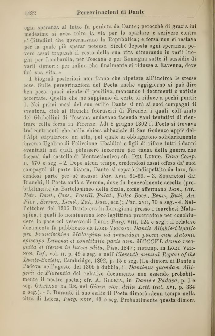 I biografi posteriori non fanno che ripetere all'incirca le stesse cose. Sulle peregrinazioni del Poeta anche oggigiorno si può dire ben poco, quasi niente di positivo, mancando i documenti o notizie accertate. Quello che ne sappiamo di certo si riduce a pochi punti: 1. Nei primi mesi del suo esilio Dante si unì ai suoi compagni di sventura, cioè ai Bianchi fuorusciti di Firenze, i quali coli'aiuto dei Ghibellini di Toscana andavano facendo vani tentativi di rientrare colla forza in Firenze. Adì 8 giugno 1302 il Poeta si trovava tra' contraenti che nella chiesa abbaziale di San Godenzo appiè dell'Alpi stipularono un atto, pel quale si obbligarono solidariamente inverso Ugolino di Feliccione Ubaldini e figli di rifare tutti i danni eventuali nei quali potessero incorrere per causa della guerra che faceasi dal castello di Montaccianico ; cfr. Del Lungo, Dino Comp. li, 570 e seg. -2. Dopo alcun tempo, credendosi assai offeso da' suoi compagni di parte bianca, Dante si separò indispettito da loro, facendosi parte per sè stesso; Par. xvn, 61-69. - 3. Separatosi dai Bianchi, il Poeta andò a Verona, dove fu benevolmente accolto (probabilmente da Bartolommeo della Scala, come affermano Dan., Ott., Pe.tr. Dani., Cass., Postili. Palai., Falso Bocc., Benv., Buti, An. Fior., Serrav., Land., Tal., Dan., ecc.); Par. xvn, 70 e seg.-4. Nell'ottobre del 1306 Dante era in Lunigiana presso i marchesi Mala-spina, i quali lo nominarono loro legittimo procuratore per conchiudere la pace col vescovo di Luni ; Purg. vili, 124 e seg.; il relativo documento fu pubblicato da Lord Verkon: Dantis Alighieri legatio prò Francischino Malaspina ad ineundam paeem cum Antonio episcopo Lunensi et constitutio pacis ami. MCCCVI. denuo reco-gnita et iterimi in lucem edita, Pisa, 1847; ristamp. in Lord Ver-non, Inf., voi. n, p. 49 e seg. e nell'Eleventh annual Report of the Dante-Society, Cambridge, 1892, p. 15 e seg. (La dimora di Dante a Padova nell'agosto del 1306 è dubbia, il Dantinus quondam Alli-gerii de Florentia del relativo documento non essendo probabilmente il nostro poeta; cfr. A. Gloria, in Dante e Padova, p. 1 e seg. Gaetano da Re, nel Giorn. stor. della Lett. ital. xvi, p. 334 e seg.). - 5. Durante il suo esilio il Poeta dimorò alcun tempo nella città di Lucca, Purg. xxiv, 43 e seg. Probabilmente questa dimora