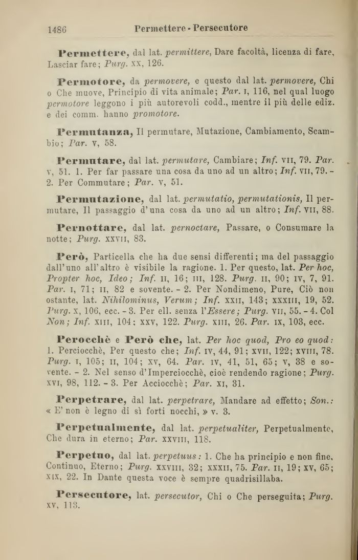Però, Particella che ha due sensi differenti; ma del passaggio dall'uno all'altro è visibile la ragione. 1. Per questo, lat. Per hoc, Propter hoc, Ideo; Inf. n, 16; iti, 128. Purg. n, 90; iv, 7, 91. Par. i, 71; il, 82 e sovente. - 2. Per Nondimeno, Pure, Ciò non ostante, lat. Nihiìominus, Veruni; Inf. xxii, 143; xxxiii, 19, 52. Purg. x, 106, ecc. -3. Per eli. senza VEssere; Purg. vii, 55.-4. Col Non; Inf. xm, 104: xxv, 122. Purg. xm, 26. Par. ix, 103, ecc.