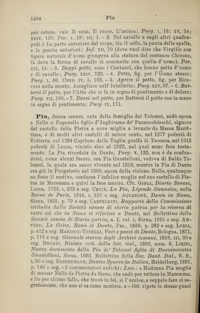 Pia, donna senese, nata della famiglia dei Tolomei, andò sposa a Nello o Paganello figlio d'Inghiramo de' Pannocchieschi, signore del castello della Pietra a nove miglia a levante da Massa Marittima, e di molti altri castelli di minor conto, nel 1277 podestà di Volterra, nel 1284 Capitano della Taglia guelfa di Toscana, nel 1313 podestà di Lucca, vissuto sino al 1322, nel qual anno fece testamento. La Pia ricordata da Dante, Purg. v, 133, non è da confondersi, come alcuni fecero, con Pia Guastelloni, vedova di Baldo Tolomei, la quale era ancor vivente nel 1318, mentre la Pia di Dante era già in Purgatorio nel 1300, epoca della visione. Nello, qualunque ne fosse il motivo, condusse l'infelice moglie nel suo castello di Pietra in Maremma e quivi la fece morire. Cfr. Gigli, Diario Sanese, Lucca, 1723. i, 333 e seg. Croix, La Pia, Legende Siennoise, nella Revue de Paris, 1844, i, 510 e seg. Aquarone, Dante in Siena, Siena, 1865, p. 79 e seg. Cartellini, Rapporto della Commissione istituita dalla Società sanese di storia patria per la ricerca di tutto ciò che in Siena si riferisce a Dante, nel Bollettino della Società sanese di Storia patria, a. I, voi. i, Siena, 1865 e seg. Ampère, La Grece, Rome et Dante, Par., 1859, p. 282 e seg. Loria, p. 412 e seg. Mazzoni-Toselli, Voci e passi di Dante, Bologna, 1871, p. 110 e seg. Giornale storico degli Archivi toscani, 1859, ili, 30 e seg. Donati, Rivista crii, della lett. ital., 1886, num. 6. Lisini, Nuovo documento della Pia de' Tolomei figlia di Buonincontro Guastelloni, Siena, 1893. Bullettino della Soc. Dant. Ital., N. S., i, 60 e seg. Bassermann, Dantes Spuren in Italien, Heidelberg, 1897, p. 143 e seg. - I commentatori antichi: Lan.: « Madonna Pia moglie di messer Nello da Pietra da Siena, che andò per rettore in Maremma, e l\e per alcuno fallo, che trovò in lei, sì l'uccise, e seppelo fare sì segretamente, che non si sa come morisse. » - Ott. ripete lo stesso quasi