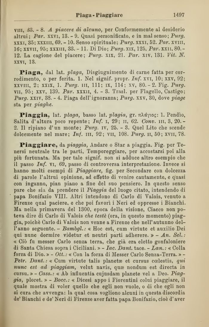 Piaggiare, da piaggia, Andare o Star a piaggia. Fig. per Tenersi neutrale tra le parti, Temporeggiare, per accostarsi poi alla più fortunata. Ma per tale signif. non si adduce altro esempio che il passo Inf. vi, 69, passo di controversa interpretazione. Invece si hanno molti esempi di Piaggiare, fig. per Secondare con dolcezza di parole l'altrui opinione, ad effetto di venire cautamente, e quasi con inganno, pian piano a fine del suo pensiero. In questo senso pare che sia da prendere il Piaggia del luogo citato, intendendo di papa Bonifazio VIII. Altri intendono di Carlo di Yalois, venuto a Firenze qual paciere, e che poi favorì i Neri ed oppresse i Bianchi. Ma nella primavera del 1300, epoca della visione, Ciacco non poteva dire di Carlo di Yalois che teste (ora, in questo momento) piaggia, poiché Carlo di Yalois non venne a Firenze che nell'autunno dell'anno seguente. - Bambgl.: « Hoc est, cum virtute et auxilio Dei qui nunc dormire videtur et neutri parti adherere. » - An. Sei. : « Ciò fu messer Carlo senza terra, che già era eletto gonfaloniere di Santa Chiesa sopra i Ciciliani. » - Iac. Dant. tace. - Dan.: « Colla forza di Dio. » - Ott.: « Con la forza di Messer Carlo Senza-Terra. » -Petr. Dant. : « Cum virtute talis planetae et cursus ccelestis, qui nunc est ad piaggiam, velut navis, qua nondum est directa in cursu. » - Cass.: « Ab influentia cujusdam planete vel a Deo. Piaggia, ploret. » - JBocc.: « Dicesi appo i Fiorentini colui piaggiare, il quale mostra di voler quello che egli non vuole, o di che egli non si cura che avvenga: la qual cosa vogliono alcuni in questa discordia de' Bianchi e de' Neri di Firenze aver fatta papa Bonifazio, cioè d'aver