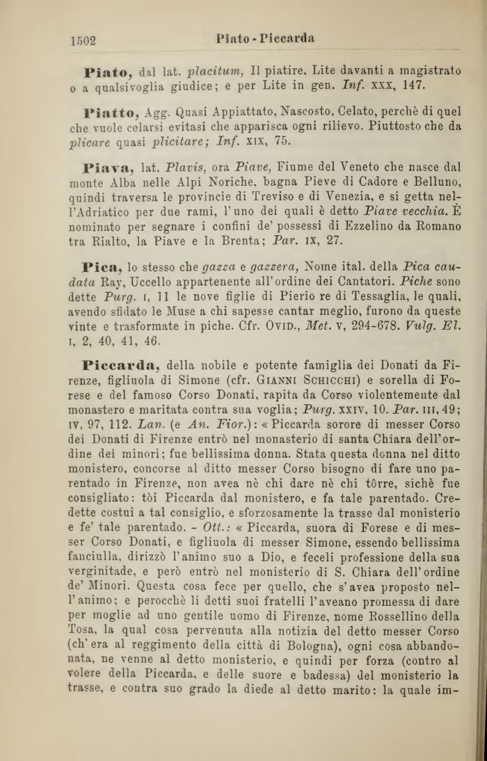 Piccarda, della nobile e potente famiglia dei Donati da Firenze, figliuola di Simone (cfr. Gianni Schicchi) e sorella di Forese e del famoso Corso Donati, rapita da Corso violentemente dal monastero e maritata contra sua voglia; Purg. xxiv, 10. Par. in, 49; iv, 97, 112. Lan. (e An. Fior.): «Piccarda sorore di messer Corso dei Donati di Firenze entrò nel inonasterio di santa Chiara dell'ordine dei minori; fue bellissima donna. Stata questa donna nel ditto monistero, concorse al ditto messer Corso bisogno di fare uno parentado in Firenze, non avea nè chi dare nè chi torre, sichè fue consigliato: tòi Piccarda dal monistero, e fa tale parentado. Credette costui a tal consiglio, e sforzosamente la trasse dal monisterio e fe' tale parentado. - Ott. : « Piccarda, suora di Forese e di messer Corso Donati, e figliuola di messer Simone, essendo bellissima fanciulla, dirizzò l'animo suo a Dio, e feceli professione della sua verginitade, e però entrò nel monisterio di S. Chiara dell'ordine de' Minori. Questa cosa fece per quello, che s'avea proposto nell'animo; e perocché li detti suoi fratelli l'aveano promessa di dare per moglie ad uno gentile uomo di Firenze, nome Rossellino della Tosa, la qual cosa pervenuta alla notizia del detto messer Corso (eh' era al reggimento della città di Bologna), ogni cosa abbandonata, ne venne al detto monisterio, e quindi per forza (contro al volere della Piccarda, e delle suore e badessa) del monisterio la trasse, e contra suo grado la diede al detto marito: la quale im-