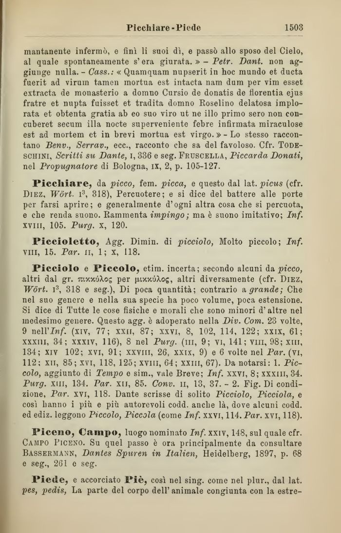 mantanente infermò, e finì li suoi dì, e passò allo sposo del Cielo, al quale spontaneamente s'era giurata. » - Petr. Dani, non aggiunge nulla. - Cass.: « Quamquam nupserit in hoc mundo et ducta fuerit ad virum tamen mortua est intacta nara dum per vim esset extracta de monasterio a domno Cursio de donatis de fiorentia ejus fratre et nupta fuisset et tradita domno Roselino delatosa implorata et obtenta gratia ah eo suo viro ut ne ilio primo sero non con-cuberet secum illa nocte superveniente febre infirmata miraculose est ad mortem et in brevi mortua est virgo. » - Lo stesso raccontano Benv., Serrav., ecc., racconto che sa del favoloso. Cfr. Tode-schini, Scritti su Dante, i, 336 e seg. Fruscella, Piccarda Donati, nel Propugnatore di Bologna, ix, 2, p. 105-127.