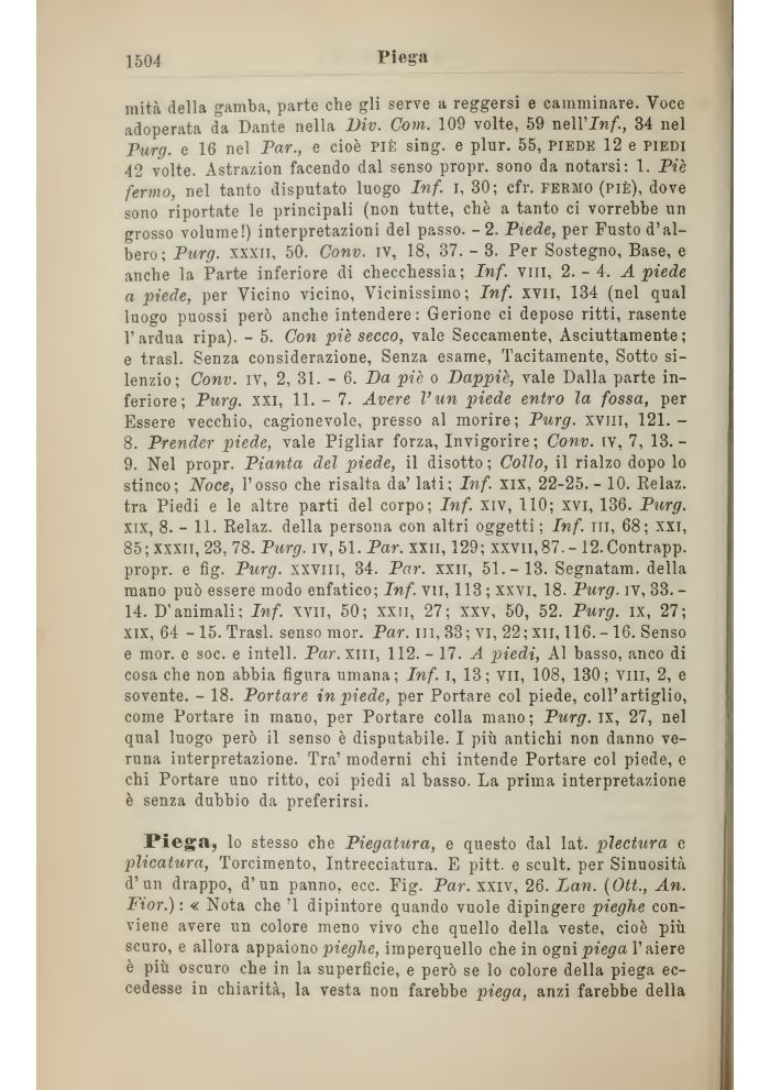 9. Nel propr. Pianta del piede, il disotto; Collo, il rialzo dopo lo stinco; Noce, l'osso che risalta da' lati; Inf. xix, 22-25.- 10. Relaz. tra Piedi e le altre parti del corpo; Inf. xiv, 110; xvi, 136. Purg. xix, 8. - 11. Relaz. della persona con altri oggetti ; Inf. in, 68; xxi, 85;xxxn, 23, 78. Purg. ìv, 51. Par. xxii, 129; xxvn,87.- 12.Contrapp. propr. e fig. Purg. xxvm, 34. Par. xxii, 51.-13. Segnatam. della mano può essere modo enfatico; Inf. vii, 113 ; xxvi, 18. Purg. ìv, 33. -14. D'animali; Inf. xvn, 50; xxii, 27; xxv, 50, 52. Purg. ix, 27; xix, 64 - 15. Trasl. senso mor. Par. ni, 33; vi, 22; xii, 116.-16. Senso e mor. e soc. e intell. Par. xiii, 112. - 17. A piedi, Al basso, anco di cosa che non abbia figura umana; Inf. I, 13; vii, 108, 130; Vili, 2, e sovente. - 18. Portare in piede, per Portare col piede, coli'artiglio, come Portare in mano, per Portare colla mano ; Purg. ix, 27, nel qual luogo però il senso è disputabile. I più antichi non danno veruna interpretazione. Tra' moderni chi intende Portare col piede, e chi Portare uno ritto, coi piedi al basso. La prima interpretazione è senza dubbio da preferirsi.