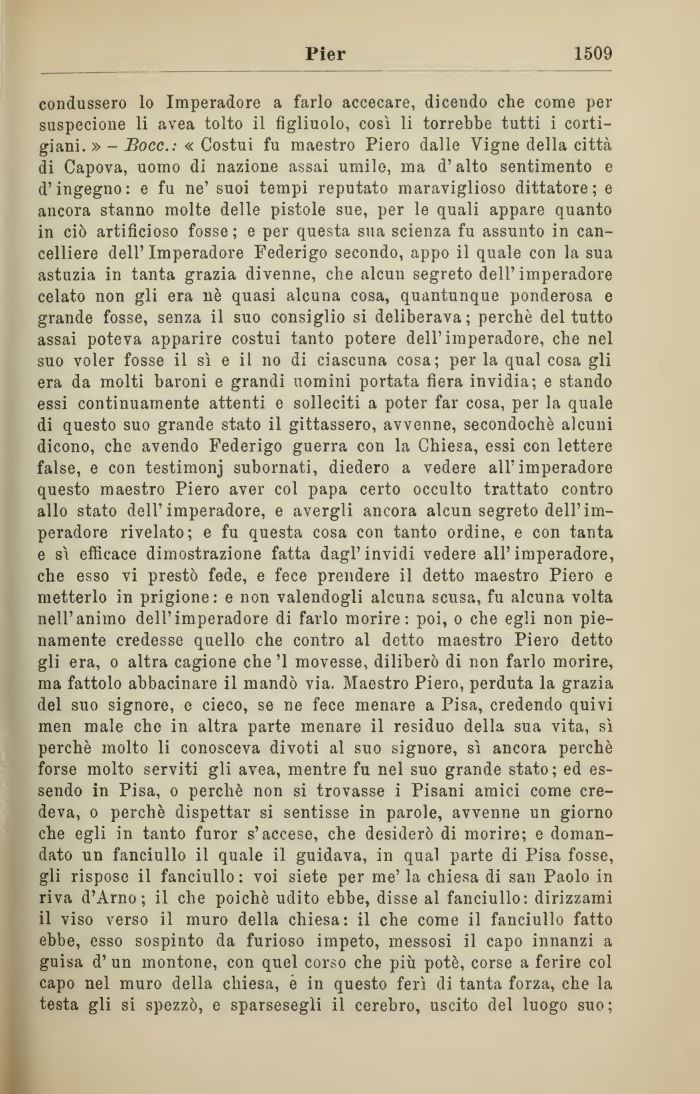 condussero lo Imperadore a farlo accecare, dicendo che come per suspecione li avea tolto il figliuolo, così li torrebbe tutti i cortigiani. » - Bocc.: « Costui fu maestro Piero dalle Vigne della città di Capova, uomo di nazione assai umile, ma d'alto sentimento e d'ingegno: e fu ne' suoi tempi reputato maraviglioso dittatore; e ancora stanno molte delle pistole sue, per le quali appare quanto in ciò artificioso fosse ; e per questa sua scienza fu assunto in cancelliere dell' Imperadore Federigo secondo, appo il quale con la sua astuzia in tanta grazia divenne, che alcun segreto dell'imperadore celato non gli era nè quasi alcuna cosa, quantunque ponderosa e grande fosse, senza il suo consiglio si deliberava; perchè del tutto assai poteva apparire costui tanto potere dell'imperadore, che nel suo voler fosse il sì e il no di ciascuna cosa; per la qual cosa gli era da molti baroni e grandi uomini portata fiera invidia; e stando essi continuamente attenti e solleciti a poter far cosa, per la quale di questo suo grande stato il gittassero, avvenne, secondochè alcuni dicono, che avendo Federigo guerra con la Chiesa, essi con lettere false, e con testimonj subornati, diedero a vedere all'imperadore questo maestro Piero aver col papa certo occulto trattato contro allo stato dell'imperadore, e avergli ancora alcun segreto dell'imperadore rivelato; e fu questa cosa con tanto ordine, e con tanta e sì efficace dimostrazione fatta dagl' invidi vedere all' imperadore, che esso vi prestò fede, e fece prendere il detto maestro Piero e metterlo in prigione: e non valendogli alcuna scusa, fu alcuna volta nell'animo dell'imperadore di farlo morire: poi, o che egli non pienamente credesse quello che contro al detto maestro Piero detto gli era, o altra cagione che '1 movesse, diliberò di non farlo morire, ma fattolo abbacinare il mandò via. Maestro Piero, perduta la grazia del suo signore, e cieco, se ne fece menare a Pisa, credendo quivi men male che in altra parte menare il residuo della sua vita, sì perchè molto li conosceva divoti al suo signore, sì ancora perchè forse molto serviti gli avea, mentre fu nel suo grande stato; ed essendo in Pisa, o perchè non si trovasse i Pisani amici come credeva, o perchè dispettar si sentisse in parole, avvenne un giorno che egli in tanto furor s'accese, che desiderò di morire; e domandato un fanciullo il quale il guidava, in qual parte di Pisa fosse, gli rispose il fanciullo : voi siete per me' la chiesa di san Paolo in riva d'Arno; il che poiché udito ebbe, disse al fanciullo: dirizzami il viso verso il muro della chiesa: il che come il fanciullo fatto ebbe, esso sospinto da furioso impeto, messosi il capo innanzi a guisa d'un montone, con quel corso che più potè, corse a ferire col capo nel muro della chiesa, è in questo ferì di tanta forza, che la testa gli si spezzò, e sparsesegli il cerebro, uscito del luogo suo;