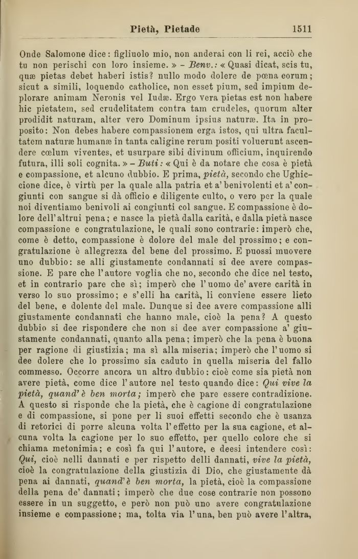 Onde Salomone dice: figliuolo mio, non anderai con li rei, acciò che tu non perischi con loro insieme. » - Benv.: « Quasi dicat, scis tu, quae pietas debet haberi istis? nullo modo dolere de poena eorum ; sicut a simili, loquendo catholice, non esset pium, sed impium deplorare animam Neronis vel Iudse. Ergo vera pietas est non habere hic pietatem, sed crudelitatem contra tam crudeles, quorum alter prodidit naturam, alter vero Dominum ipsius naturse. Ita in proposito: Non debes habere compassionem erga istos, qui ultra facul-tatem naturse humanse in tanta caligine rerum positi voluerunt ascendere coelum viventes, et usurpare sibi divinum officium, inquirendo futura, il li soli cognita. » - Buti : « Qui è da notare che cosa è pietà e compassione, et alcuno dubbio. E prima, pietà, secondo che Ughic-cione dice, è virtù per la quale alla patria et a'benivolenti et a'congiunti con sangue si dà officio e diligente culto, o vero per la quale noi diventiamo benivoli ai congiunti col sangue. E compassione è dolore dell' altrui pena ; e nasce la pietà dalla carità, e dalla pietà nasce compassione e congratulazione, le quali sono contrarie: imperò che, come è detto, compassione è dolore del male del prossimo; e congratulazione è allegrezza del bene del prossimo. E puossi muovere uno dubbio: se alli giustamente condannati si dee avere compassione. E pare che l'autore voglia che no, secondo che dice nel testo, et in contrario pare che sì; imperò che l'uomo de'avere carità in verso lo suo prossimo; e s'elli ha carità, li conviene essere lieto del bene, e dolente del male. Dunque si dee avere compassione alli giustamente condannati che hanno male, cioè la pena? A questo dubbio si dee rispondere che non si dee aver compassione a' giustamente condannati, quanto alla pena; imperò che la pena è buona per ragione di giustizia; ma sì alla miseria; imperò che l'uomo si dee dolere che lo prossimo sia caduto in quella miseria del fallo commesso. Occorre ancora un altro dubbio : cioè come sia pietà non avere pietà, come dice l'autore nel testo quando dice: Qui vive la pietà, quand'è ben morta ; imperò che pare essere contradizione. A questo si risponde che la pietà, che è cagione di congratulazione e di compassione, si pone per li suoi effetti secondo che è usanza di retorici di porre alcuna volta l'effetto per la sua cagione, et alcuna volta la cagione per lo suo effetto, per quello colore che si chiama metonimia; e così fa qui l'autore, e deesi intendere così: Qui, cioè nelli dannati e per rispetto delli dannati, vive la pietà, cioè la congratulazione della giustizia di Dio, che giustamente dà pena ai dannati, quand'è ben morta, la pietà, cioè la compassione della pena de' dannati ; imperò che due cose contrarie non possono essere in un suggetto, e però non può uno avere congratulazione insieme e compassione; ma, tolta via l'una, ben può avere l'altra,