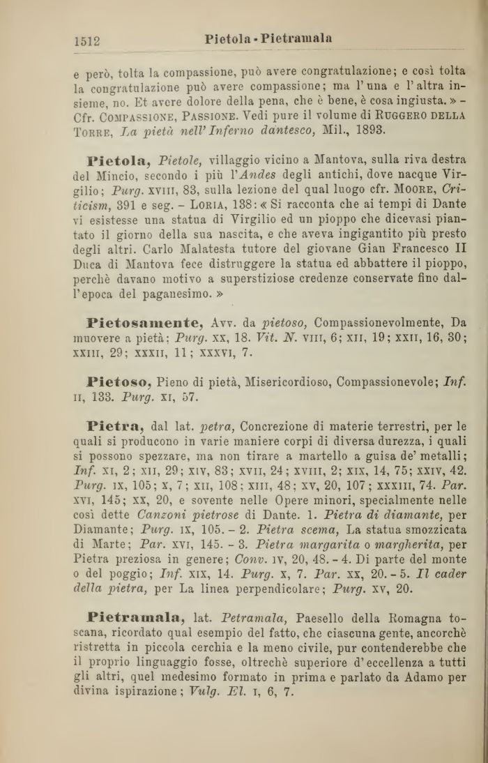 Pietra, dal lat. petra, Concrezione di materie terrestri, per le quali si producono in varie maniere corpi di diversa durezza, i quali si possono spezzare, ma non tirare a martello a guisa de'metalli ; Inf. xi, 2; xii, 29; xiv, 83; xvn, 24; xviii, 2; xix, 14, 75; xxiv, 42. Purg. ix, 105; x, 7; xii, 108; xiii, 48; xv, 20, 107; xxxm, 74. Par. xvi, 145; xx, 20, e sovente nelle Opere minori, specialmente nelle così dette Canzoni pietrose di Dante. 1. Pietra di diamante, per Diamante; Purg. ix, 105.-2. Pietra scema, La statua smozzicata di Marte; Par. xvi, 145. - 3. Pietra margarita o margherita, per Pietra preziosa in genere; Conv. iv, 20, 48.-4. Di parte del monte o del poggio; Inf. xix, 14. Purg. x, 7. Par. xx, 20.-5. Il cader della pietra, per La linea perpendicolare; Purg. xv, 20.