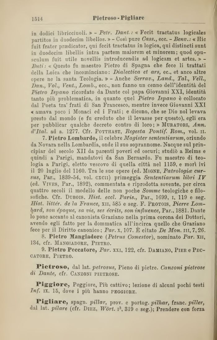 in dodici libricciuoli. » - Petr. Dant. : « Fecit tractatus logicales partitos in duodecim libellos. » - Cosi pure Gass., ecc. - Benv.: « Hic fuit frater prsedicator, qui fecit tractatus in logica, qui distincti sunt in duodecim libellis intra partem maiorem et minorem; quod opu-sculum fuit utile novellis introducendis ad logicam et artes. » -Buti : «Questo fu maestro Pietro di Spagna che fece li trattati della Loica che incominciano: Dialectica et ars, ec., et anco altre opere ne la santa Teologia. » - Anche Serrav., Land., Tal., Veli., Dan., Voi., Vent., Lomb., ecc., non fanno un cenno dell'identità del Pietro Ispano ricordato da Dante col papa Giovanni XXI, identità tanto più problematica, in quanto quel Pietro Ispano è collocato dal Poeta tra' frati di San Francesco, mentre invece Giovanni XXI « amava poco i Monaci ed i Frati; e dicono, che se Dio noi levava presto dal mondo (e fu creduto che il levasse per questo), egli era per pubblicar qualche decreto contro di loro ; » Muratori, Ann. d'Hai, ad a. 1277. Cfr. Potthast, Regesta Pontif. Rom., voi. n.