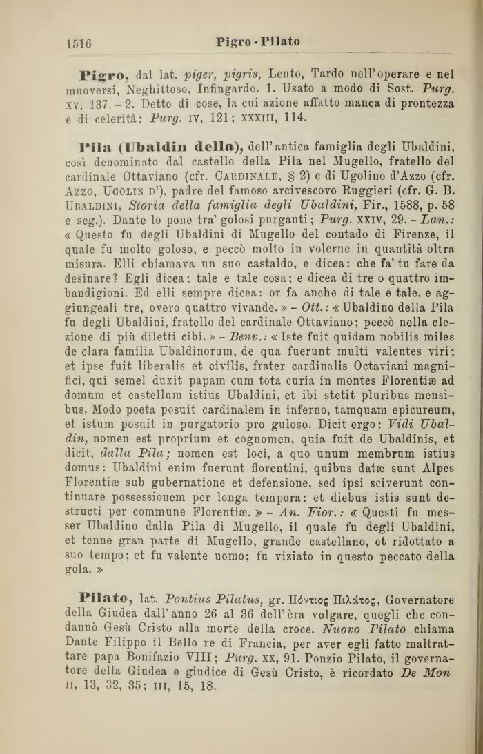 l'ila (Ubaldin della), dell'antica famiglia degli Ubaldini, così denominato dal castello della Pila nel Mugello, fratello del cardinale Ottaviano (cfr. Cardinale, § 2) e di Ugolino d'Azzo (cfr. Azzo, Ugolin d'), padre del famoso arcivescovo Ruggieri (cfr. G. B. Ubaldini, Storia della famiglia degli Ubaldini, Fir., 1588, p. 58 e seg.). Dante lo pone tra' golosi purganti; Purg. xxiv, 29.-Dan.: « Questo fu degli Ubaldini di Mugello del contado di Firenze, il quale fu molto goloso, e peccò molto in volerne in quantità oltra misura. Elli chiamava un suo castaido, e dicea: che fa'tu fare da desinare? Egli dicea: tale e tale cosa; e dicea di tre o quattro imbandigioni. Ed elli sempre dicea: or fa anche di tale e tale, e ag-giungeali tre, overo quattro vivande. » - Ott. : « Ubaldino della Pila fu degli Ubaldini, fratello del cardinale Ottaviano; peccò nella elezione di più diletti cibi. » - Benv.: « Iste fuit quidam nobilis miles de clara familia Ubaldinorum, de qua fuerunt multi valentes viri; et ipse fuit liberalis et civilis, frater cardinalis Octaviani magnifici, qui semel duxit papam cum tota curia in montes Fiorenti® ad domum et castellum istius Ubaldini, et ibi stetit pluribus mensi-bus. Modo poeta posuit cardinalem in inferno, tamquam epicureum, et istum posuit in purgatorio prò guloso. Dicit ergo : Vidi Ubaldin, nomen est proprium et cognomen, quia fuit de Ubaldinis, et dicit, dalla Pila; nomen est loci, a quo unum membrum istius domus : Ubaldini enim fuerunt fiorentini, quibus dat® sunt Alpes Fiorenti® sub gubernatione et defensione, sed ipsi sciverunt continuare possessionem per longa tempora: et diebus istis sunt de-structi per commune FlorentiaB. » - An. Fior. : « Questi fu messer Ubaldino dalla Pila di Mugello, il quale fu degli Ubaldini, et tenne gran parte di Mugello, grande castellano, et ridottato a suo tempo; et fu valente uomo; fu viziato in questo peccato della gola. »