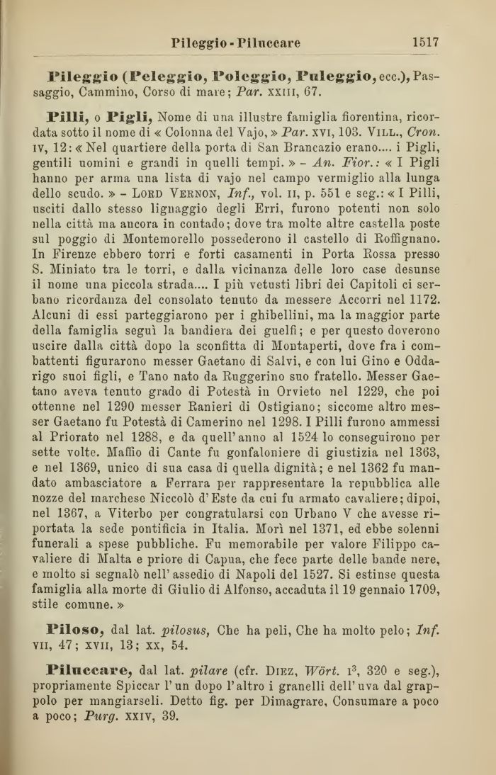 Pilli, o Pigli, Nome di una illustre famiglia fiorentina, ricordata sotto il nome di « Colonna del Vajo, » Par. xvi, 103. Vill., Cron. iv, 12: «Nel quartiere della porta di San Brancazio erano.... i Pigli, gentili uomini e grandi in quelli tempi. » - An. Fior. : « I Pigli hanno per arma una lista di vajo nel campo vermiglio alla lunga dello scudo. » - Lord Yernon, Inf., voi. n, p. 551 e seg.: « I Pilli, usciti dallo stesso lignaggio degli Erri, furono potenti non solo nella città ma ancora in contado; dove tra molte altre castella poste sul poggio di Montemorello possederono il castello di Roffignano. In Firenze ebbero torri e forti casamenti in Porta Rossa presso S. Miniato tra le torri, e dalla vicinanza delle loro case desunse il nome una piccola strada.... I più vetusti libri dei Capitoli ci serbano ricordanza del consolato tenuto da messere Accorri nel 1172. Alcuni di essi parteggiarono per i ghibellini, ma la maggior parte della famiglia seguì la bandiera dei guelfi; e per questo doverono uscire dalla città dopo la sconfitta di Montaperti, dove fra i combattenti figurarono messer Gaetano di Salvi, e con lui Gino e Odda-rigo suoi figli, e Tano nato da Ruggerino suo fratello. Messer Gaetano aveva tenuto grado di Potestà in Orvieto nel 1229, che poi ottenne nel 1290 messer Ranieri di Ostigiano; siccome altro messer Gaetano fu Potestà di Camerino nel 1298.1 Pilli furono ammessi al Priorato nel 1288, e da quell'anno al 1524 lo conseguirono per sette volte. Maffio di Cante fu gonfaloniere di giustizia nel 1363, e nel 1369, unico di sua casa di quella dignità; e nel 1362 fu mandato ambasciatore a Ferrara per rappresentare la repubblica alle nozze del marchese Niccolò d'Este da cui fu armato cavaliere; dipoi, nel 1367, a Viterbo per congratularsi con Urbano V che avesse riportata la sede pontificia in Italia. Morì nel 1371, ed ebbe solenni funerali a spese pubbliche. Fu memorabile per valore Filippo cavaliere di Malta e priore di Capua, che fece parte delle bande nere, e molto si segnalò nell'assedio di Napoli del 1527. Si estinse questa famiglia alla morte di Giulio di Alfonso, accaduta il 19 gennaio 1709, stile comune. »