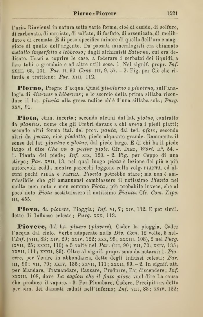 Piovere, dal lat. pluere (piovere), Cader la pioggia. Cader l'acqua dal cielo. Verbo adoperato nella Div. Com. 12 volte, 5 nel-Ylnf. (vili, 83; xiv, 29; xxiv, 122; xxx, 95; xxxm, 108), 2 nel Purg. (xvn, 25; xxxii, 110) e 5 volte nel Par. (ni, 90; vii, 70; xxiv, 135; xxvii, 111; xxxii, 89). Oltre al signif. propr. sono da notarsi: 1. Piovere, per Venire in abbondanza, detto degli influssi celesti; Par. in, 90; vii, 70; xxiv, 135; xxvii, 111; xxxii, 89.-2. In signif. att. per Mandare, Tramandare, Causare, Produrre, Far discendere ; Inf. xxxm, 108, dove La cagion che il fiato piove vuol dire La causa che produce il vapore. - 3. Per Piombare, Cadere, Precipitare, detto per sim. dei dannati caduti nell'inferno; Inf. vili, 83; xxiv, 122;
