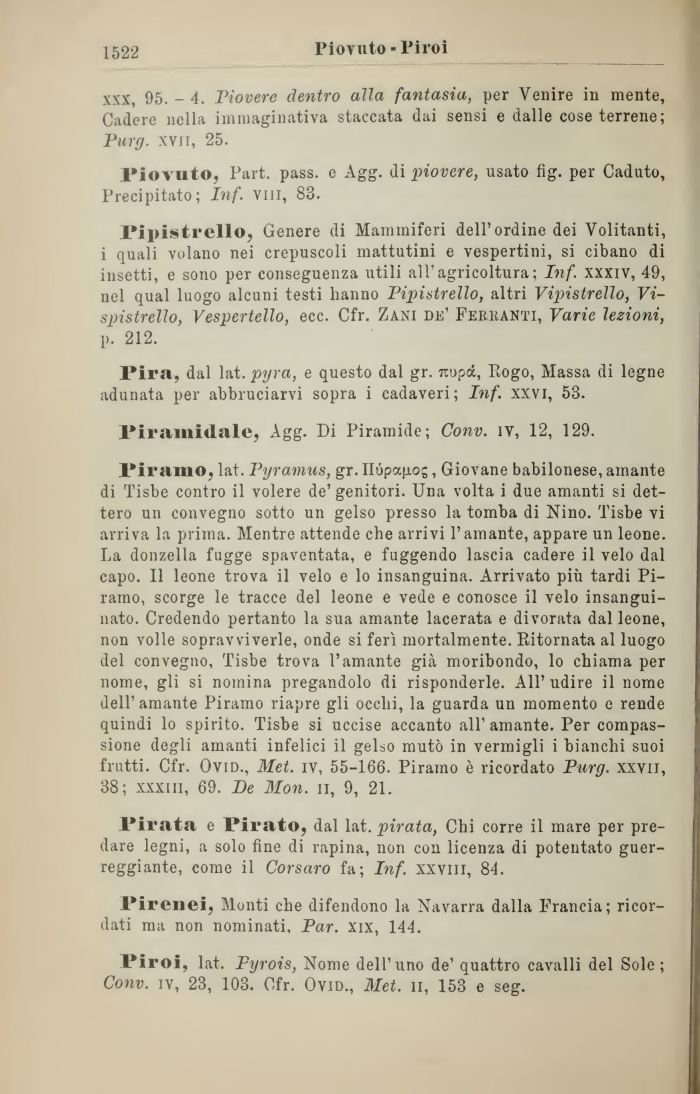 Piramo, lat. Pyramus, gr. IIópa,j.og, Giovane babilonese, amante di Tisbe contro il volere de' genitori. Una volta i due amanti si dettero un convegno sotto un gelso presso la tomba di Nino. Tisbe vi arriva la prima. Mentre attende che arrivi l'amante, appare un leone. La donzella fugge spaventata, e fuggendo lascia cadere il velo dal capo. Il leone trova il velo e lo insanguina. Arrivato più tardi Pi-ramo, scorge le tracce del leone e vede e conosce il velo insanguinato. Credendo pertanto la sua amante lacerata e divorata dal leone, non volle sopravviverle, onde si ferì mortalmente. Ritornata al luogo del convegno, Tisbe trova l'amante già moribondo, lo chiama per nome, gli si nomina pregandolo di risponderle. All'udire il nome dell'amante Piramo riapre gli occhi, la guarda un momento e rende quindi lo spirito. Tisbe si uccise accanto all'amante. Per compassione degli amanti infelici il gelso mutò in vermigli i bianchi suoi frutti. Cfr. Ovid., Met. iv, 55-166. Piramo è ricordato Purg. xxvii, 38; xxxm, 69. De Mon. n, 9, 21.