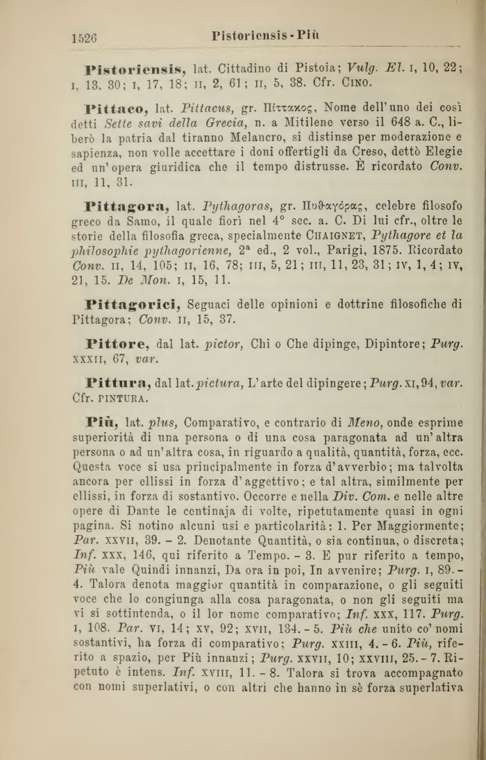 Pittagora, lat. Pythagoras, gr. nuO-ayópas, celebre filosofo greco da Samo, il quale fiorì nel 4° sec. a. C. Di lui cfr., oltre le storie della filosofia greca, specialmente Ciiaignet, Pythagore et la pliilosophie pythagorienne, 2a ed., 2 voi., Parigi, 1875. Ricordato Conv. il, 14, 105; il, 16, 78; in, 5, 21 ; ni, 11, 23, 31 ; ìv, 1, 4 ; ìv, 21, 15. De Mon. i, 15, 11.