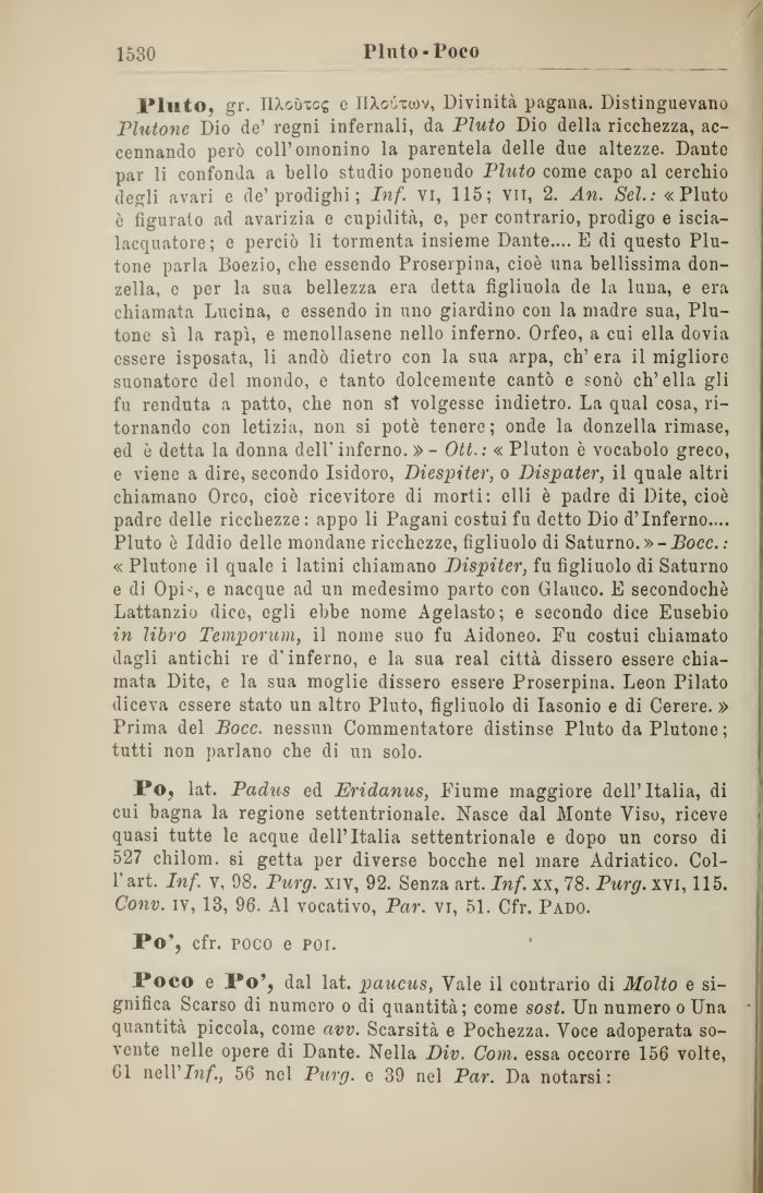 Pluto, gr. riXoùTC£ e nXouxwv, Divinità pagana. Distinguevano Plutone Dio de' regni infernali, da Pluto Dio della ricchezza, accennando però coll'oinonino la parentela delle due altezze. Dante par li confonda a hello studio ponendo Pluto come capo al cerchio degli avari e de'prodighi ; Inf. vi, 115; vii, 2. An. Sei.: «Pluto è figurato ad avarizia e cupidità, e, per contrario, prodigo e iscia-lacquatore; e perciò li tormenta insieme Dante.... E di questo Plutone parla Boezio, che essendo Proseipina, cioè una bellissima donzella, e per la sua bellezza era detta figliuola de la luna, e era chiamata Lucina, e essendo in uno giardino con la madre sua, Plutone sì la rapì, e menollasene nello inferno. Orfeo, a cui ella dovia essere isposata, li andò dietro con la sua arpa, eh' era il migliore suonatore del mondo, e tanto dolcemente cantò e sonò ch'ella gli fu renduta a patto, che non st volgesse indietro. La qual cosa, ritornando con letizia, non si potè tenere; onde la donzella rimase, ed è detta la donna dell'inferno.» - Ott.: « Pluton è vocabolo greco, e viene a dire, secondo Isidoro, Diespiter, o Dispater, il quale altri chiamano Orco, cioè ricevitore di morti: elli è padre di Dite, cioè padre delle ricchezze : appo li Pagani costui fu detto Dio d'Inferno.... Pluto è Iddio delle mondane ricchezze, figliuolo di Saturno. »-Bocc.: « Plutone il quale i latini chiamano Dispiter, fu figliuolo di Saturno e di Opis e nacque ad un medesimo parto con Glauco. E secondochè Lattanzio dico, egli ebbe nome Agelasto; e secondo dice Eusebio in libro Temporum, il nome suo fu Aidoneo. Fu costui chiamato dagli antichi re d'inferno, e la sua real città dissero essere chiamata Dite, e la sua moglie dissero essere Proserpina. Leon Pilato diceva essere stato un altro Pluto, figliuolo di Iasonio e di Cerere. » Prima del Bocc. nessun Commentatore distinse Pluto da Plutone; tutti non parlano che di un solo.