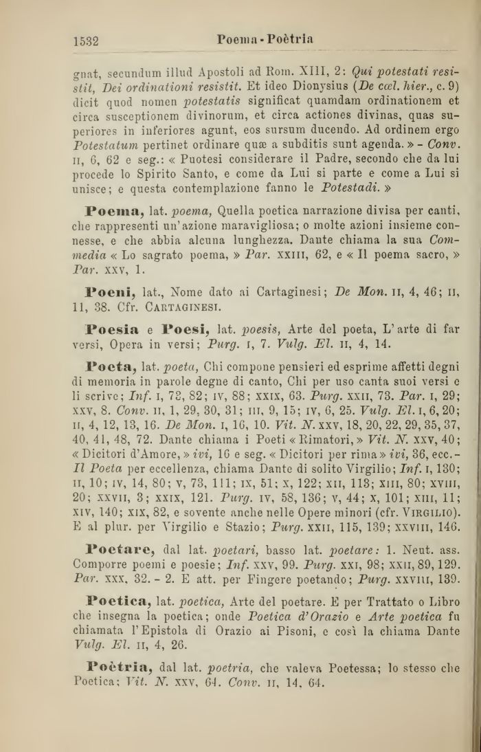 Poeta, lat. poeta, Chi compone pensieri ed esprime affetti degni di memoria in parole degne di canto, Chi per uso canta suoi versi e li scrive; Inf. i, 73, 82; iv, 88; xxix, 63. Purg. xxn, 73. Par. i, 29; xxv, 8. Conv. il, 1, 29, 30, 31 ; ni, 9, 15; iv, 6, 25. Vúg. El. i, 6, 20; il, 4, 12, 13, 16. De Mon. i, 16, 10. Vit. N. xxv, 18, 20, 22, 29, 35, 37, 40, 41, 48, 72. Dante chiama i Poeti « Fumatori, » Vit. N. xxv, 40; « Dicitori d'Amore, » ivi, 16 e seg. « Dicitori per rima» ivi, 36, ecc.-II Poeta per eccellenza, chiama Dante di solito Virgilio; Inf. i, 130; il, 10; iv, 14, 80; v, 73, 111; ix, 51; x, 122; xii, 113; xiii, 80; xvin, 20; xxvii, 3; xxix, 121. Purg. iv, 58, 136; v, 44; x, 101; xiii, 11; xiv, 140; xix, 82, e sovente anche nelle Opere minori (cfr. Virgilio). E al plur. per Virgilio e Stazio; Purg. xxn, 115, 139; xxviii, 146.