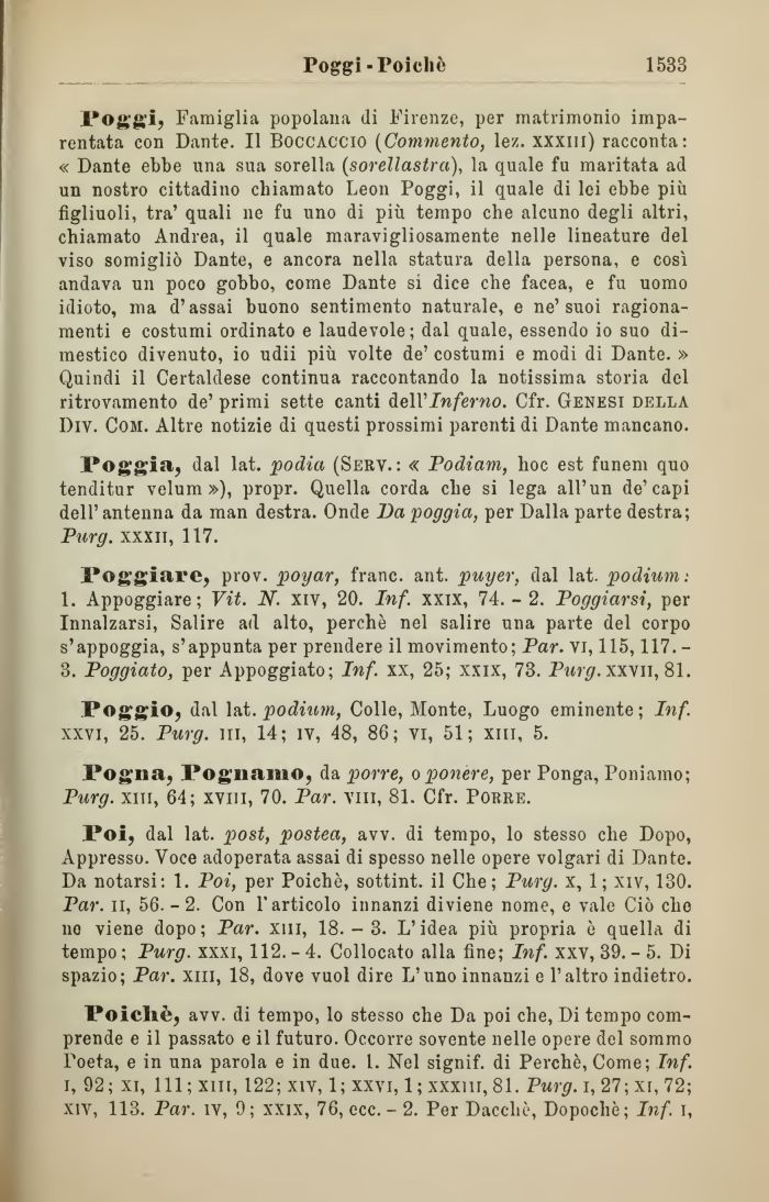 Poi, dal lat. post, postea, avv. di tempo, lo stesso che Dopo, Appresso. Voce adoperata assai di spesso nelle opere volgari di Dante. Da notarsi: 1. Poi, per Poiché, sottint. il Che; Purg. x, 1; xiv, 130. Par. il, 56.-2. Con l'articolo innanzi diviene nome, e vale Ciò che no viene dopo; Par. xiii, 18.-3. L'idea più propria è quella di tempo; Purg. xxxi, 112.-4. Collocato alla fine; Inf. xxv, 39. - 5. Di spazio; Par. xiii, 18, dove vuol dire L'uno innanzi e l'altro indietro.