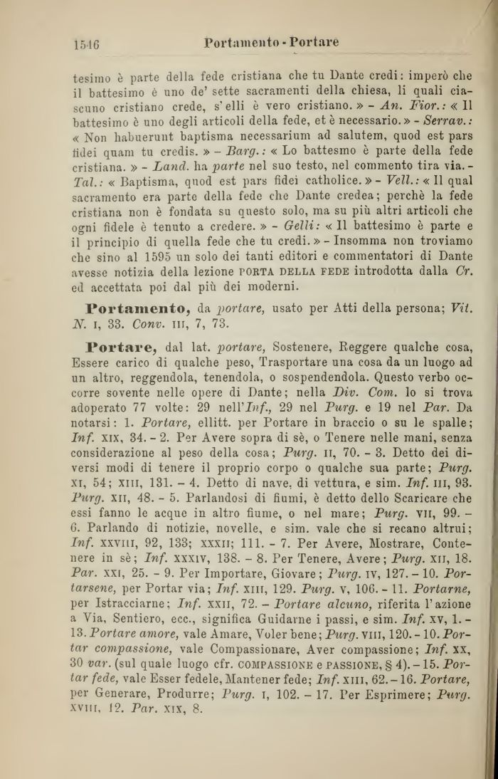 Portare, dal lat. portare, Sostenere, Reggere qualche cosa, Essere carico di qualche peso, Trasportare una cosa da un luogo ad un altro, reggendola, tenendola, o sospendendola. Questo verbo occorre sovente nelle opere di Dante; nella Div. Com. lo si trova adoperato 77 volte: 29 neli'Inf., 29 nel Purg. e 19 nel Par. Da notarsi: 1. Portare, ellitt. per Portare in braccio o su le spalle; Inf. xix, 34. - 2. Per Avere sopra di sè, o Tenere nelle mani, senza considerazione al peso della cosa; Purg. n, 70. - 3. Detto dei diversi modi di tenere il proprio corpo o qualche sua parte; Purg. xi, 54; xiii, 131. - 4, Detto di nave, di vettura, e sim. Inf. in, 93. Purg. xii, 48. - 5. Parlandosi di fiumi, è detto dello Scaricare che essi fanno le acque in altro fiume, o nel mare; Purg. vii, 99.-6. Parlando di notizie, novelle, e sim. vale che si recano altrui; Inf. xxvill, 92, 133; xxxii; 111. - 7. Per Avere, Mostrare, Contenere in sè ; Inf. xxxiv, 138. - 8. Per Tenere, Avere ; Purg. xii, 18. Par. xxi, 25. - 9. Per Importare, Giovare ; Purg. ìv, 127. - 10. Portarsene, per Portar via; Inf. xiii, 129. Purg. v, 106. - 11. Portarne, per Istracciarne; Inf. xxii, 72. - Portare alcuno, riferita l'azione a Via, Sentiero, ecc., significa Guidarne i passi, e sim. Inf. xv, 1.-13. Portare amore, vale Amare, Voler bene; Purg. vili, 120.- 10. Portar compassione, vale Compassionare, Aver compassione; Inf. xx, 30 var. (sul quale luogo cfr. compassione e passione, § 4). -15. Portar fede, vale Esser fedele, Mantener fede; Inf. xiii, 62.-16. Portare, per Generare, Produrre; Purg. l, 102. - 17. Per Esprimere; Purg. xviii, 12. Par. xix, 8.