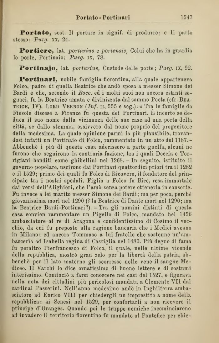 Portinarl, nobile famiglia fiorentina, alla quale apparteneva Folco, padre di quella Beatrice che andò sposa a messer Simone dei Bardi e che, secondo il Boce. ed i molti suoi non ancora estinti seguaci, fu la Beatrice amata e divinizzata dal sommo Poeta (cfr. Beatrice, IV). Lord Vernon (Inf. n, 555 e seg.): « Tra le famiglie da Fiesole discese a Firenze fu questa dei Portinari. E incerto se deduca il suo nome dalla vicinanza delle sue case ad una porta della città, se dallo stemma, ossivvero dal nome proprio del progenitore della medesima. La quale opinione parmi la più plausibile, trovandosi infatti un Portinaio di Folco, rammentato in un atto del 1187.-Abbenchè i più di questa casa aderissero a parte guelfa, alcuni ne furono che seguirono la contraria fazione, tra i quali Doccia e Tor-rigiani banditi come ghibellini nel 1268. - In seguito, istituito il governo popolare, uscirono dai Portinari quattordici priori tra il 1282 e il 1529; primo dei quali fu Folco di Bicovero, il fondatore del principale tra i nostri spedali. Figlia a Folco fu Bice, resa immortale dai versi dell'Alighieri, che l'amò senza potere ottenerla in consorte. Fu invece a lei marito messer Simone dei Bardi; ma per poco, perchè giovanissima morì nel 1290 (? la Beatrice di Dante morì nel 1290; ma la Beatrice Bardi-Portinari?). - Tra gli uomini distinti di questa casa convien rammentare un Pigello di Folco, mandato nel 1456 ambasciatore al re di Aragona e confidentissimo di Cosimo il vecchio, da cui fu preposto alla ragione bancaria che i Medici aveano in Milano; ed ancora Tommaso a lui fratello che sostenne un'ambascerìa ad Isabella regina di Castiglia nel 1480. Più degno di fama fu peraltro Pierfrancesco di Folco, il quale, nelle ultime vicende della repubblica, mostrò gran zelo per la libertà della patria, ab-benchè per il lato materno gli scorresse nelle vene il sangue Mediceo. Il Varchi lo dice ornatissimo di buone lettere e di costumi interissimo. Cominciò a farsi conoscere nei casi del 1527, e figurava nella nota dei cittadini più pericolosi mandata a Clemente VII dal cardinal Passerini. Nell'anno medesimo andò in Inghilterra ambasciatore ad Enrico Vili per chiedergli un imprestito a nome della repubblica; ai Senesi nel 1529, per confortarli a non ricevere il principe d'Oranges. Quando poi le truppe nemiche incominciarono ad invadere il territorio fiorentino fu mandato al Pontefice per chie-