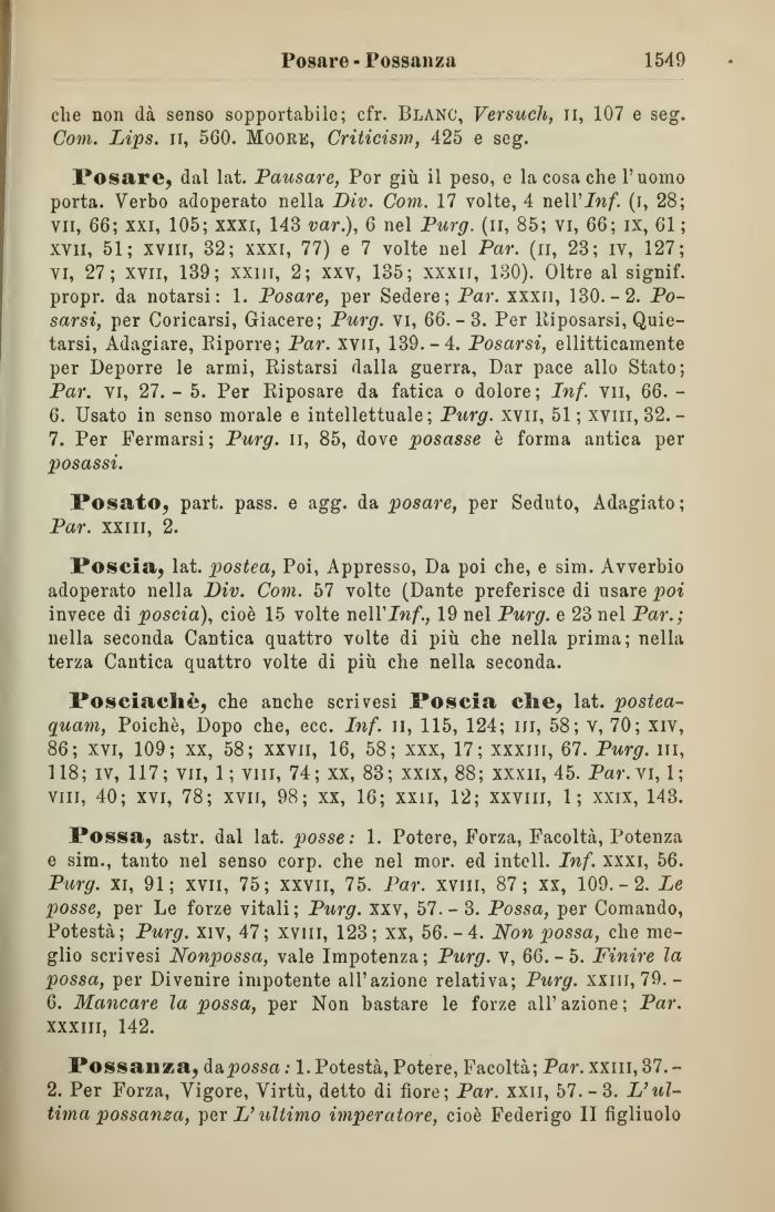 Poscia, lat. postea, Poi, Appresso, Da poi che, e sim. Avverbio adoperato nella Div. Com. 57 volte (Dante preferisce di usare poi invece di poscia), cioè 15 volte neWInf., 19 nel Purg. e 23 nel Par.; nella seconda Cantica quattro volte di più che nella prima; nella terza Cantica quattro volte di più che nella seconda.