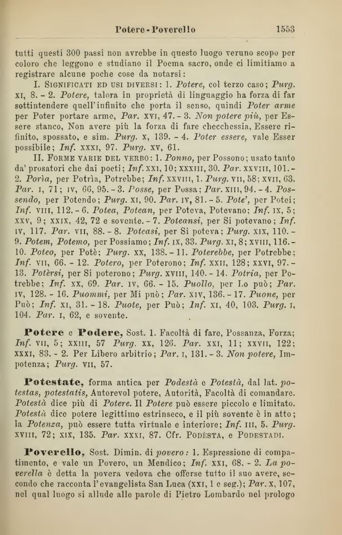 Potere e Podere, Sost. 1. Facoltà di faro, Possanza, Forza; Inf. vii, 5; xxiii, 57 Purg. xx, 126. Par. xxi, 11; xxvii, 122; xxxi, 83. - 2. Per Libero arbitrio; Par. i, 131.-3. Non potere, Impotenza; Purg. vii, 57.