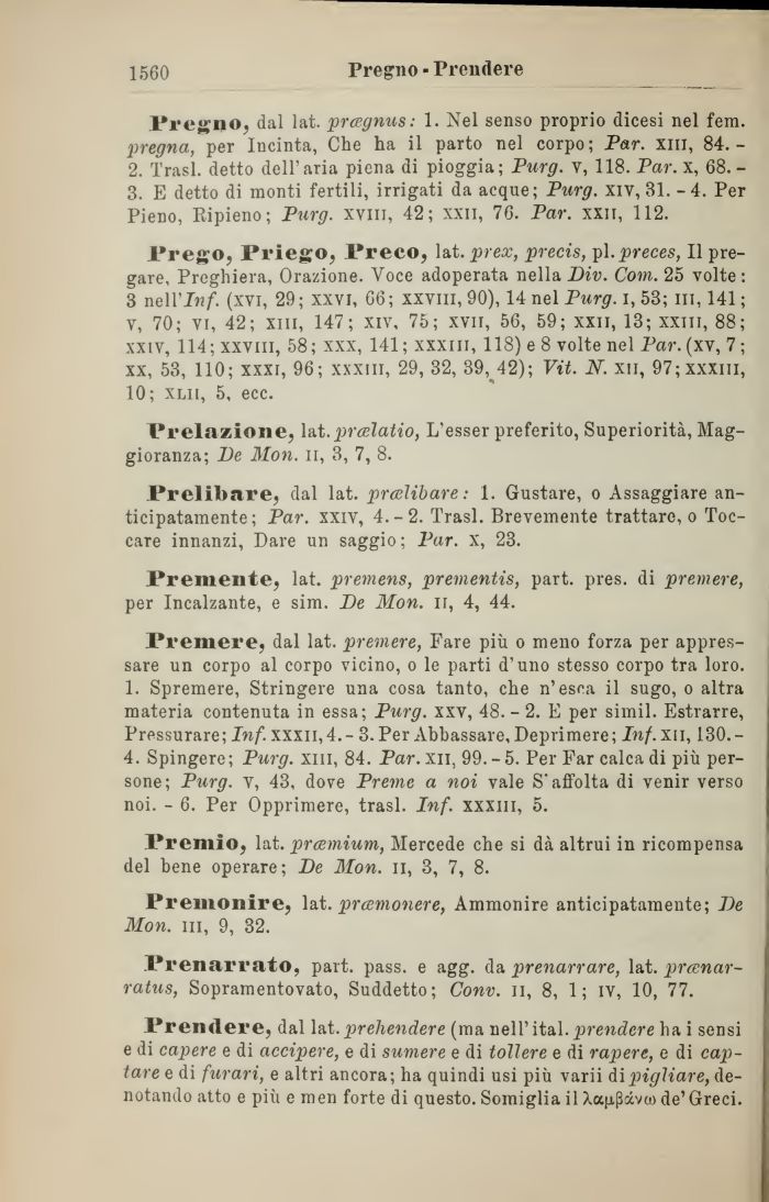 Prego, Priego, Preco, lat. prex, precis, pi.preces, Il pregare, Preghiera, Orazione. Voce adoperata nella Div. Com. 25 volte : 3 nell'I??/, (xvi, 29; xxvi, 66; xxvm, 90), 14 nel Purg. i, 53; in, 141; V, 70; Vi, 42; xm, 147; xiv, 75; xvn, 56, 59; xxii, 13; xxiii, 88; xxiv, 114; xxvm, 58; xxx, 141; xxxiii, 118) e 8 volte nel Par. (xv, 7; xx, 53, 110; xxxi, 96; xxxm, 29, 32, 39, 42); Vit. N. xii, 97; xxxiii, 10; xlii, 5, ecc.