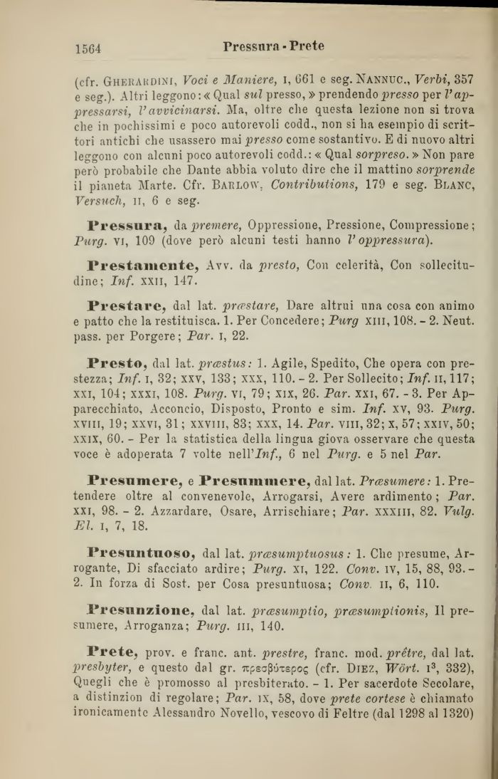 Presto, dal lat. prcestus: 1. Agile, Spedito, Che opera con prestezza; Inf. i, 32; xxv, 133; xxx, 110.-2. Per Sollecito; Inf. ir, 117; xxi, 104; xxxi, 108. Purg. vi, 79; xix, 26. Par. xxi, 67. - 3. Per Apparecchiato, Acconcio, Disposto, Pronto e sim. Inf. xv, 93. Purg. xvm, 19; xxvi, 31 ; xxviii, 83; xxx, 14. Par. vili, 32; x, 57; xxiv, 50; xxix, 60. - Per la statistica della lingua giova osservare che questa voce è adoperata 7 volte neWInf., 6 nel Purg. e 5 nel Par.