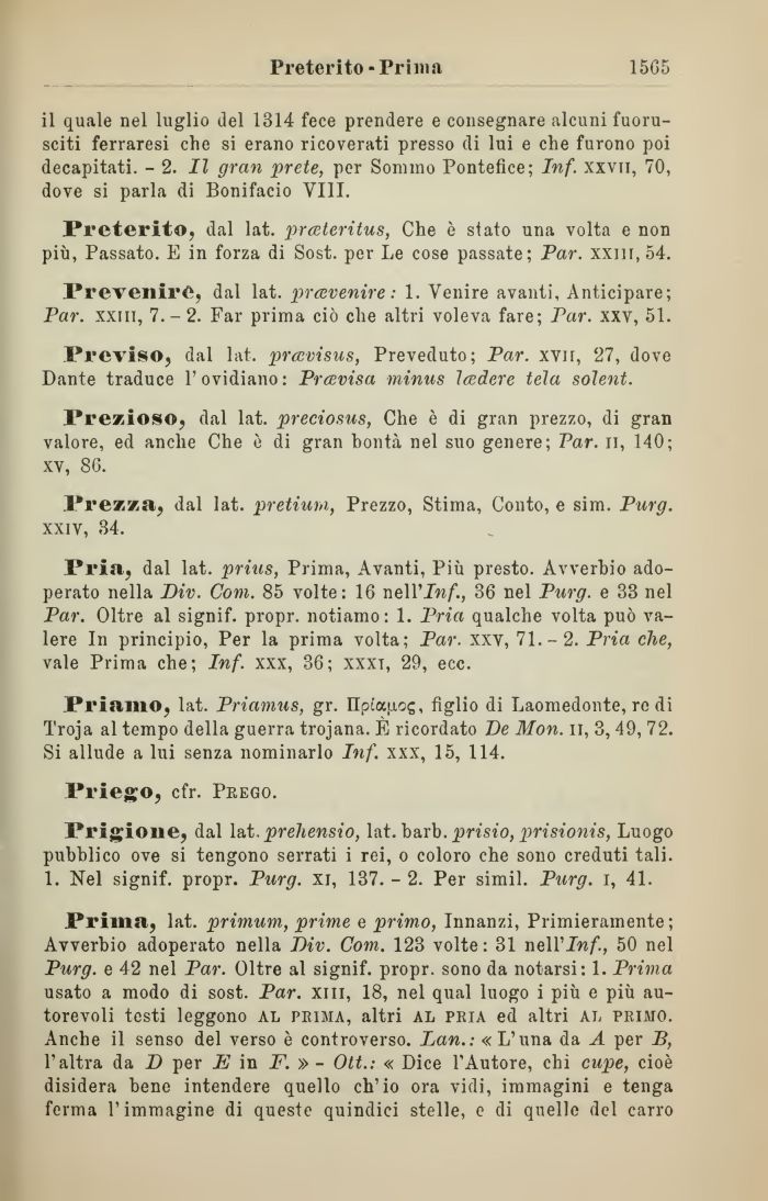 Prima, lat. primum, prime e primo, Innanzi, Primieramente; Avverbio adoperato nella Viv. Com. 123 volte : 31 nell'Inf., 50 nel Purg. e 42 nel Par. Oltre al signif. propr. sono da notarsi: 1. Prima usato a modo di sost. Par. xiii, 18, nel qual luogo i più e più autorevoli testi leggono al prima, altri al pria ed altri al primo. Anche il senso del verso è controverso. Dan.: « L'una da A per B, l'altra da D per E in F. » - Ott.: « Dice l'Autore, chi cupe, cioè disidera bene intendere quello ch'io ora vidi, immagini e tenga ferma l'immagine di queste quindici stelle, e di quelle del carro