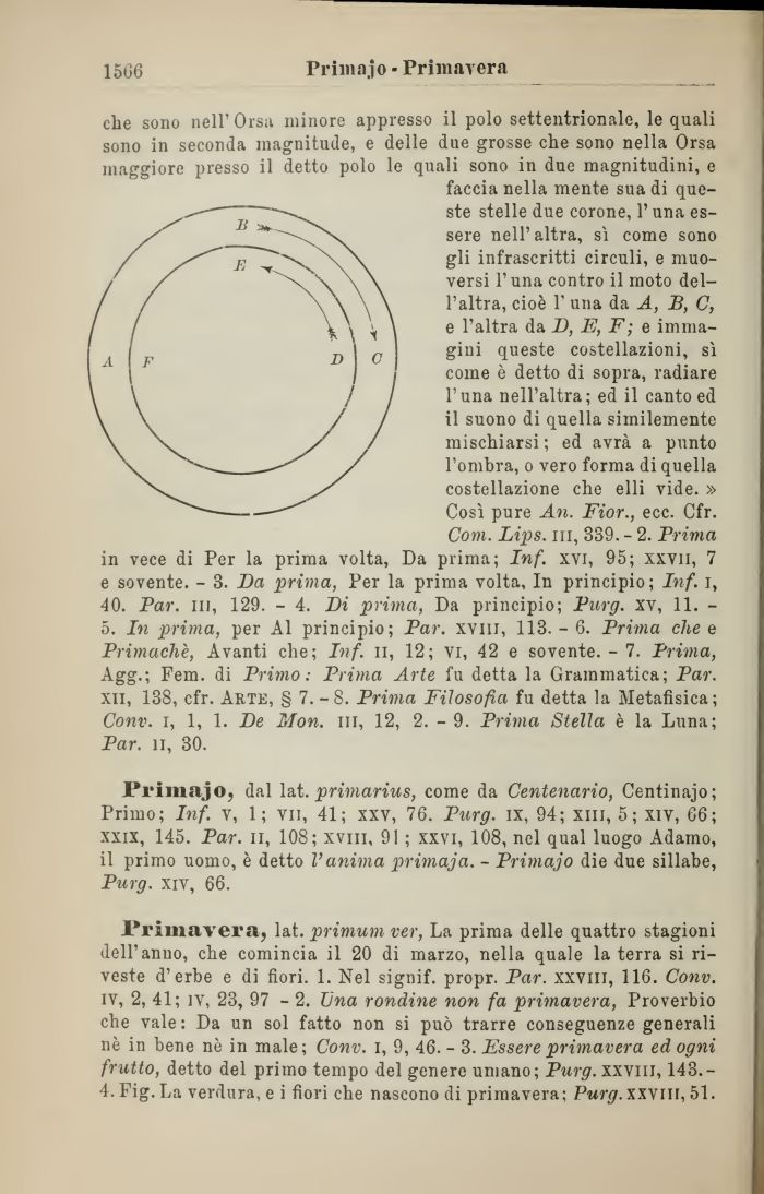 Primavera, lat. primum ver, La prima delle quattro stagioni dell'anno, che comincia il 20 di marzo, nella quale la terra si riveste d'erbe e di fiori. 1. Nel signif. propr. Par. xxvm, 116. Conv. iv, 2, 41; iv, 23, 97 - 2. Una rondine non fa primavera, Proverbio che vale : Da un sol fatto non si può trarre conseguenze generali nè in bene nè in male ; Conv. I, 9, 46. - 3. Essere primavera ed ogni frutto, detto del primo tempo del genere umano; Purg. xxvm, 143.-4. Fig. La verdura, e i fiori che nascono di primavera; Pttr^.xxvm, 51.