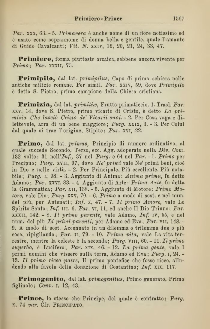 Primo, dal lat. primus, Principio di numero ordinativo, al quale succede Secondo, Terzo, ecc. Agg. adoperato nella Div. Com. 132 volte: 31 nell'In/., 37 nel Purg. e 64 nel Par. - 1. Primo per Precipuo; Purg. xvn, 97, dove Ne' primi vale Ne'primi beni, cioè in Dio e nelle virtù. - 2. Per Principale, Più eccellente, Più notabile; Purg. i, 98. - 3. Aggiunto di Anima: Anima prima, fu detto Adamo; Par. xxvi, 83.-4 Aggiunto di Arte: Prima Arte, fu detta la Grammatica; Par. xii, 138. - 5. Aggiunto di Motore: Primo Motore, vale Dio; Purg. xxv, 70. - 6. Primo a modo di sost. e nel num. del più, per Antenati ; Inf. x, 47. - 7. Il primo Amore, vale Lo Spirito Santo; Inf. in, 6. Par. vi, 11, ed anche II Dio Triuno; Par. xxxii, 142. - 8. Il primo parente, vale Adamo, Inf. iv, 55, e nel num. del più Li primi parenti, per Adamo ed Eva; Par. vii, 148. -9. A modo di sost. Accennate in un dilemma o trilemma due o più cose, ripigliando; Par. n, 79. - 10. Prima vita, vale La vita terrestre, mentre la celeste è la seconda; Purg. Vili, 60.- 11.11 primo superbo, è Lucifero; Par. xix, 46.- 12. La prima gente, vale I primi uomini che vissero sulla terra, Adamo ed Eva; Purg. I, 24. -13. Il primo ricco patre, Il primo pontefice che fosse ricco, alludendo alla favola della donazione di Costantino; Inf. xix, 117.