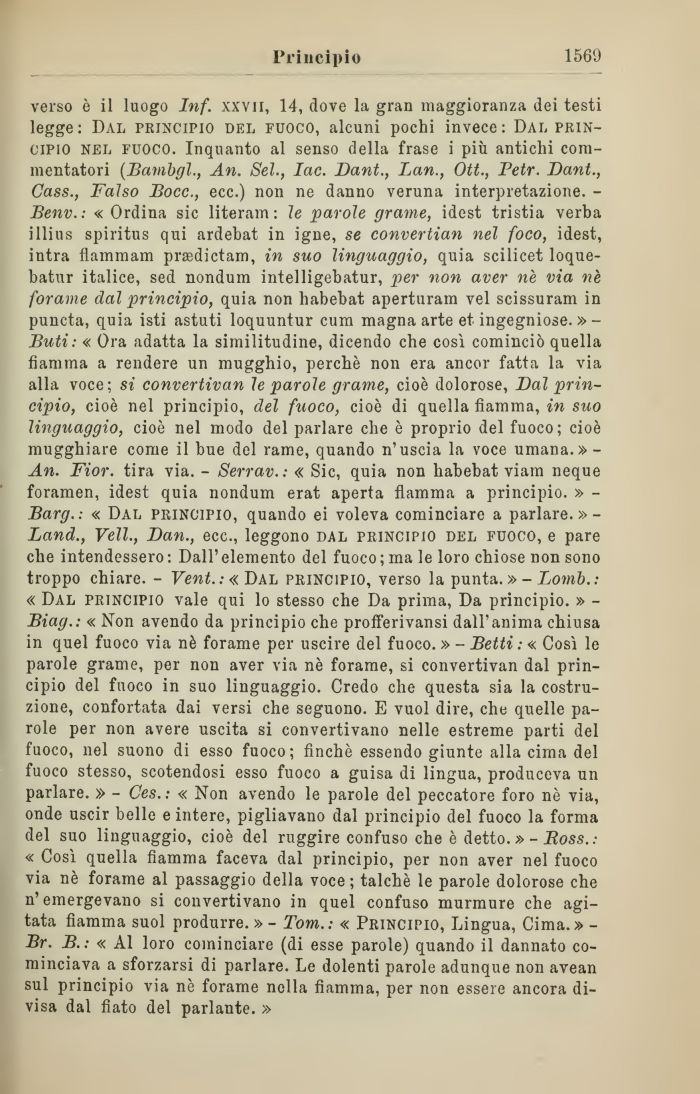 verso è il luogo Inf. xxvii, 14, dove la gran maggioranza dei testi legge: Dal principio del fuoco, alcuni pochi invece: Dal principio nel fuoco. Inquanto al senso della frase i più antichi commentatori (Bambgl., An. Sei., Iac. Dant., Lan., Ott., Petr. Dant., Cass., Falso Bocc., ecc.) non ne danno veruna interpretazione. -Benv.: « Ordina sic literam : le parole grame, idest tristia verba ìIlius spiritus qui ardebat in igne, se convertian nel foco, idest, intra flammam prsedictam, in suo linguaggio, quia scilicet loque-batur italice, sed nondum intelligebatur, per non aver nè via nè forame dal principio, quia non habebat aperturam vel scissuram in puncta, quia isti astuti loquuntur cum magna arte et ingegniose. »-Buti: « Ora adatta la similitudine, dicendo che così cominciò quella fiamma a rendere un mugghio, perchè non era ancor fatta la via alla voce; si convertivan le parole grame, cioè dolorose, Dal principio, cioè nel principio, del fuoco, cioè di quella fiamma, in suo linguaggio, cioè nel modo del parlare che è proprio del fuoco; cioè mugghiare come il bue del rame, quando n'uscia la voce umana. »-An. Fior, tira via. - Serrav.: « Sic, quia non habebat viam neque foramen, idest quia nondum erat aperta fiamma a principio. » -Barg.: « Dal princìpio, quando ei voleva cominciare a parlare. »-Land., Veli., Dan., ecc., leggono dal principio del fuoco, e pare che intendessero : Dall' elemento del fuoco ; ma le loro chiose non sono troppo chiare. - Vent. .-«Dal principio, verso la punta. »- Lomb. : « Dal principio vale qui lo stesso che Da prima, Da principio. » -Biag.: « Non avendo da principio che profferivansi dall'anima chiusa in quel fuoco via nè forame per uscire del fuoco. » - Betti : « Così le parole grame, per non aver via nè forame, si convertivan dal principio del fuoco in suo linguaggio. Credo che questa sia la costruzione, confortata dai versi che seguono. E vuol dire, che quelle parole per non avere uscita si convertivano nelle estreme parti del fuoco, nel suono di esso fuoco; finché essendo giunte alla cima del fuoco stesso, scotendosi esso fuoco a guisa di lingua, produceva un parlare. » - Ces.: « Non avendo le parole del peccatore foro nè via, onde uscir belle e intere, pigliavano dal principio del fuoco la forma del suo linguaggio, cioè del ruggire confuso che è detto. »- Boss. : « Così quella fiamma faceva dal principio, per non aver nel fuoco via nè forame al passaggio della voce; talché le parole dolorose che n'emergevano si convertivano in quel confuso murmure che agitata fiamma suol produrre. » - Tom.: « Principio, Lingua, Cima.» -Br. B. : « Al loro cominciare (di esse parole) quando il dannato cominciava a sforzarsi di parlare. Le dolenti parole adunque non avean sul principio via nè forame nella fiamma, per non essere ancora divisa dal fiato del parlante. »