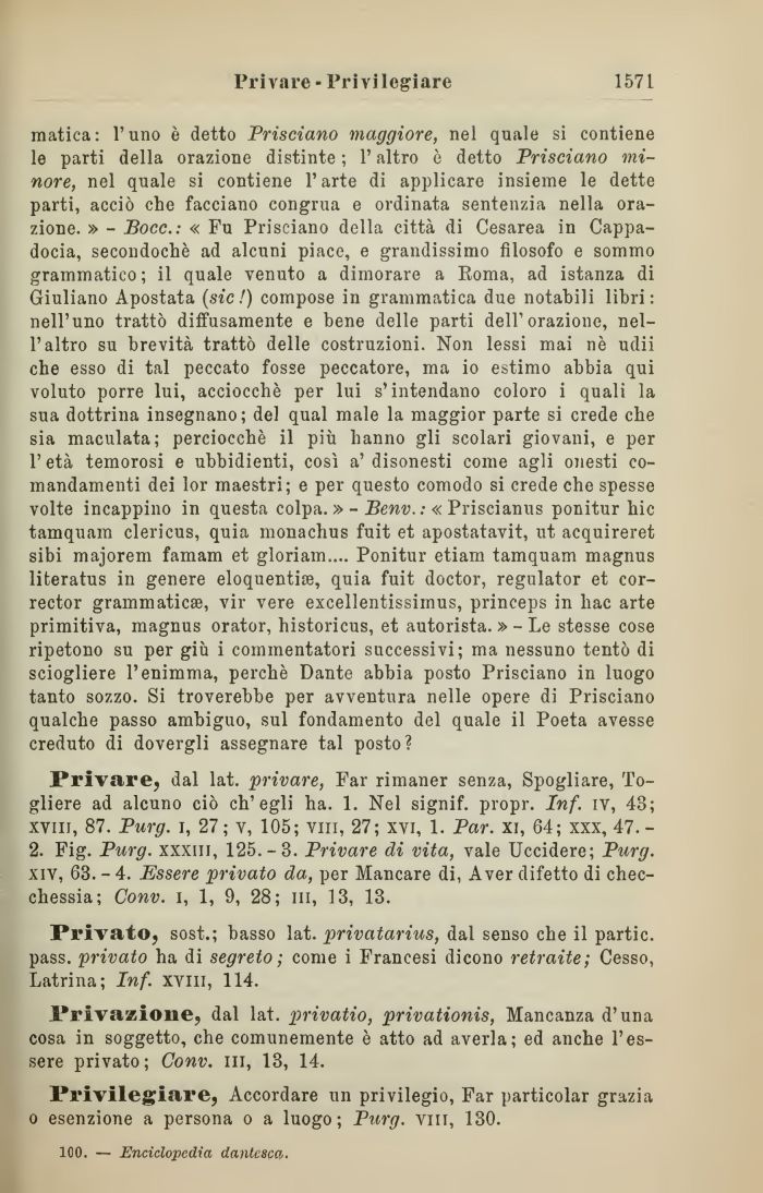 matica: l'uno è detto Prisciano maggiore, nel quale si contiene le parti della orazione distinte ; l'altro è detto Prisciano minore, nel quale si contiene l'arte di applicare insieme le dette parti, acciò che facciano congrua e ordinata sentenzia nella orazione. » - Bocc.: « Fu Prisciano della città di Cesarea in Cappa-docia, secondochè ad alcuni piace, e grandissimo filosofo e sommo grammatico; il quale venuto a dimorare a Roma, ad istanza di Giuliano Apostata (sic!) compose in grammatica due notabili libri: nell'uno trattò diffusamente e bene delle parti dell'orazione, nell'altro su brevità trattò delle costruzioni. Non lessi mai nè udii che esso di tal peccato fosse peccatore, ma io estimo abbia qui voluto porre lui, acciocché per lui s'intendano coloro i quali la sua dottrina insegnano; del qual male la maggior parte si crede che sia maculata; perciocché il più hanno gli scolari giovani, e per l'età temorosi e ubbidienti, così a' disonesti come agli onesti comandamenti dei lor maestri; e per questo comodo si crede che spesse volte incappino in questa colpa. »- Benv. :« Priscianus ponitur hic tamquam clericus, quia monachus fuit et apostatavit, ut acquireret sibi majorem famam et gloriam.... Ponitur etiam tamquam magnus literatus in genere eloquenti», quia fuit doctor, regulator et cor-rector grammaticse, vir vere excellentissirnus, princeps in hac arte primitiva, magnus orator, historicus, et autorista. » - Le stesse cose ripetono su per giù i commentatori successivi; ma nessuno tentò di sciogliere l'enimma, perchè Dante abbia posto Prisciano in luogo tanto sozzo. Si troverebbe per avventura nelle opere di Prisciano qualche passo ambiguo, sul fondamento del quale il Poeta avesse creduto di dovergli assegnare tal posto?