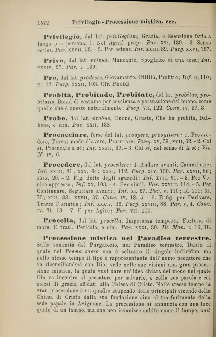 Procedere, dal lat. procedere: 1. Andare avanti, Camminare; Inf. xxiii, 81; xxv, 64; xxxi, 112. Purg. xiv, 130. Par. xxvii, 86; xxix, 20. - 2. Fig. detto degli sguardi; Inf. xvn, 61. - 3. Per Venire appresso; Inf. xx, 103.-4. Per simil. Par. xxvm, 114.-5. Per Continuare, Seguitare avanti; Inf. xi, 67. Par. v, 110; ix, 111; xi, 73; xm, 88; xxvii, 37. Conv. iv, 18, 5. - 6. E fig. per Derivare, Trarre l'origine; Inf. xxxiv, 36. Purg. xxvm, 88. Par. v, 4. Conv. iv, 21, 13. - 7. E per Agire; Par. vii, 110.