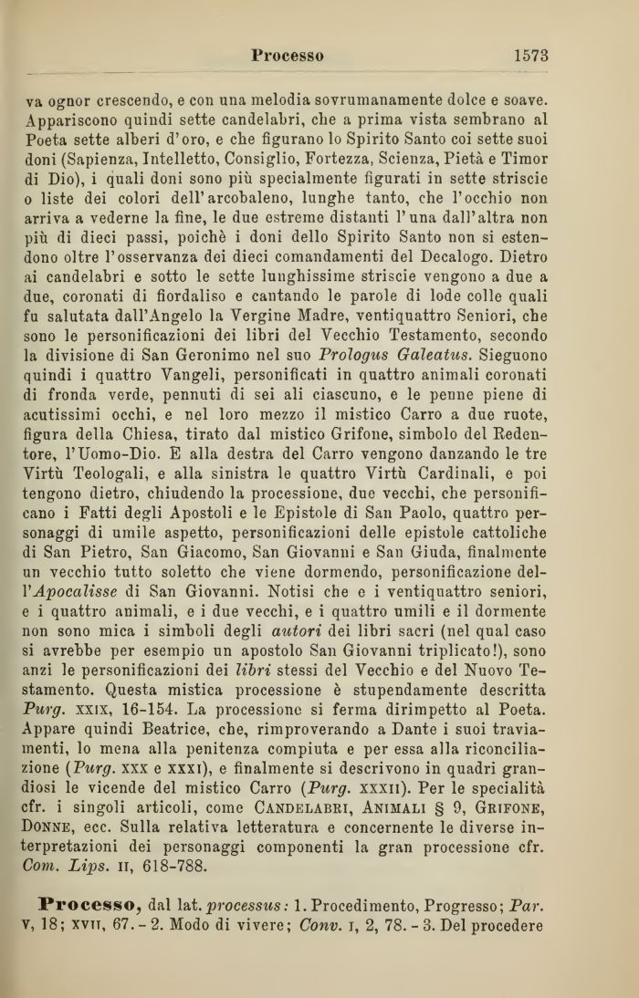 va ognor crescendo, e con una melodia sovrumanamente dolce e soave. Appariscono quindi sette candelabri, che a prima vista sembrano al Poeta sette alberi d'oro, e che figurano lo Spirito Santo coi sette suoi doni (Sapienza, Intelletto, Consiglio, Fortezza, Scienza, Pietą e Timor di Dio), i quali doni sono pił specialmente figurati in sette striscio o liste dei colori dell'arcobaleno, lunghe tanto, che l'occhio non arriva a vederne la fine, le due estreme distanti l'una dall'altra non pił di dieci passi, poiché i doni dello Spirito Santo non si estendono oltre l'osservanza dei dieci comandamenti del Decalogo. Dietro ai candelabri e sotto le sette lunghissime striscie vengono a due a due, coronati di fiordaliso e cantando le parole di lode colle quali fu salutata dall'Angelo la Vergine Madre, ventiquattro Seniori, che sono le personificazioni dei libri del Vecchio Testamento, secondo la divisione di San Geronimo nel suo Proģogus Gaģeatus. Sieguono quindi i quattro Vangeli, personificati in quattro animali coronati di fronda verde, pennuti di sei ali ciascuno, e le penne piene di acutissimi occhi, e nel loro mezzo il mistico Carro a due ruote, figura della Chiesa, tirato dal mistico Grifone, simbolo del Redentore, l'Uomo-Dio. E alla destra del Carro vengono danzando le tre Virtł Teologali, e alla sinistra le quattro Virtł Cardinali, e poi tengono dietro, chiudendo la processione, due vecchi, che personificano i Fatti degli Apostoli e le Epistole di San Paolo, quattro personaggi di umile aspetto, personificazioni delle epistole cattoliche di San Pietro, San Giacomo, San Giovanni e San Giuda, finalmente un vecchio tutto soletto che viene dormendo, personificazione del-VApocalisse di San Giovanni. Notisi che e i ventiquattro seniori, e i quattro animali, e i due vecchi, e i quattro umili e il dormente non sono mica i simboli degli autori dei libri sacri (nel qual caso si avrebbe per esempio un apostolo San Giovanni triplicato!), sono anzi le personificazioni dei libri stessi del Vecchio e del Nuovo Testamento. Questa mistica processione č stupendamente descritta Purg. xxix, 16-154. La processiono si ferma dirimpetto al Poeta. Appare quindi Beatrice, che, rimproverando a Dante i suoi traviamenti, lo mena alla penitenza compiuta e per essa alla riconciliazione (Purg. xxx e xxxi), e finalmente si descrivono in quadri grandiosi le vicende del mistico Carro (Purg. xxxn). Per le specialitą cfr. i singoli articoli, come Candelabri, Animali § 9, Grifone, Donne, ecc. Sulla relativa letteratura e concernente le diverse interpretazioni dei personaggi componenti la gran processione cfr. Com. Lips. il, 618-788.
