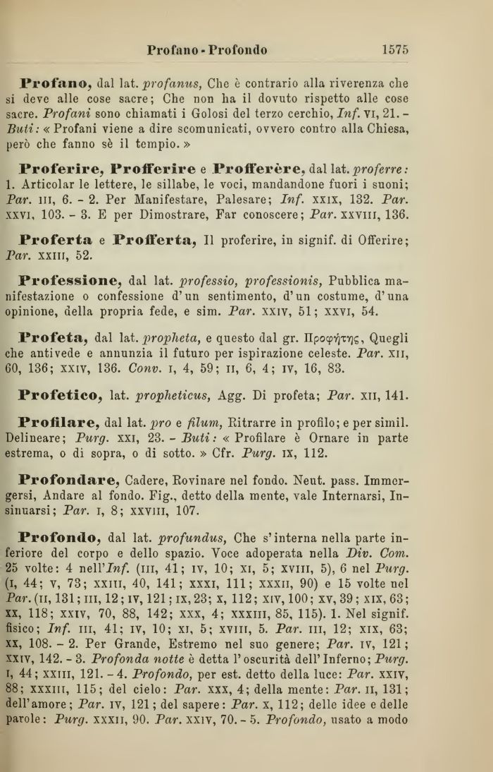 Profano, dal lat. profanus, Che è contrario alla riverenza che si deve alle cose sacre; Che non ha il dovuto rispetto alle cose sacre. Profani sono chiamati i Golosi del terzo cerchio, Inf. vi, 21. -Bufi: « Profani viene a dire scomunicati, ovvero contro alla Chiesa, però che fanno sè il tempio. »